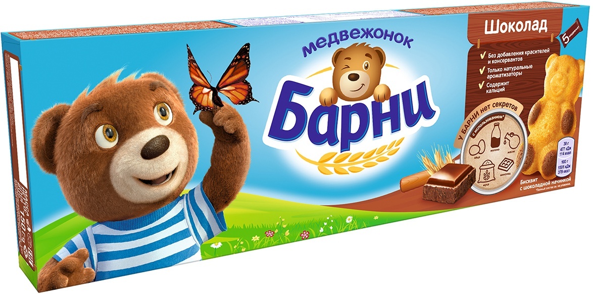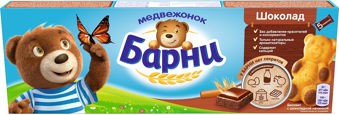 БАРНИ МЕДВЕЖОНОК пирожное бисквитное с шоколадной начинкой и начинкой со вкусом ореха 150г