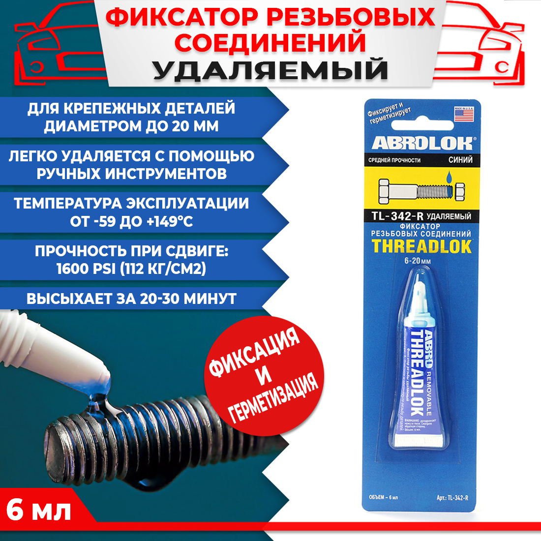 Фиксатор резьбы "Abro", неудаляемый, цвет: красный, 6 мл