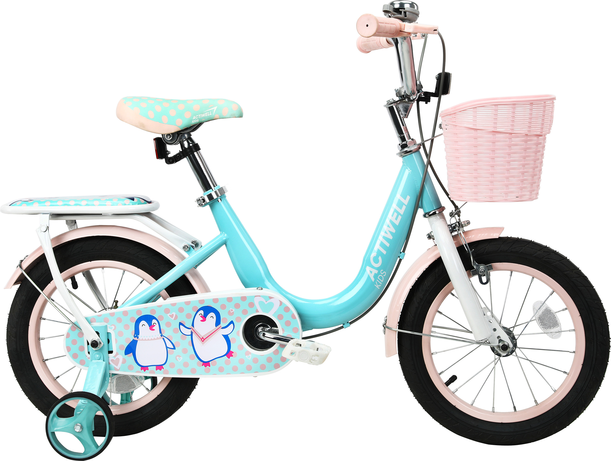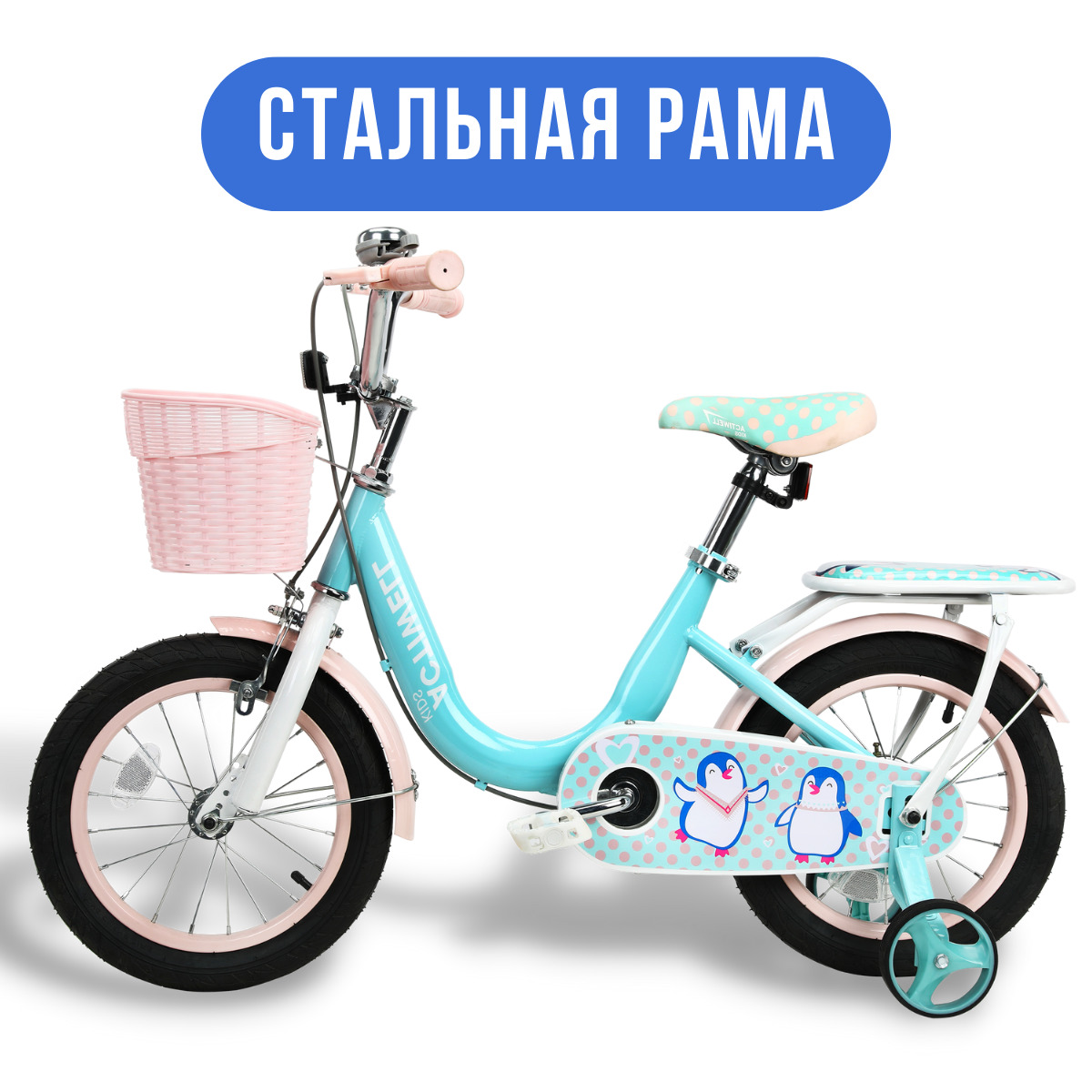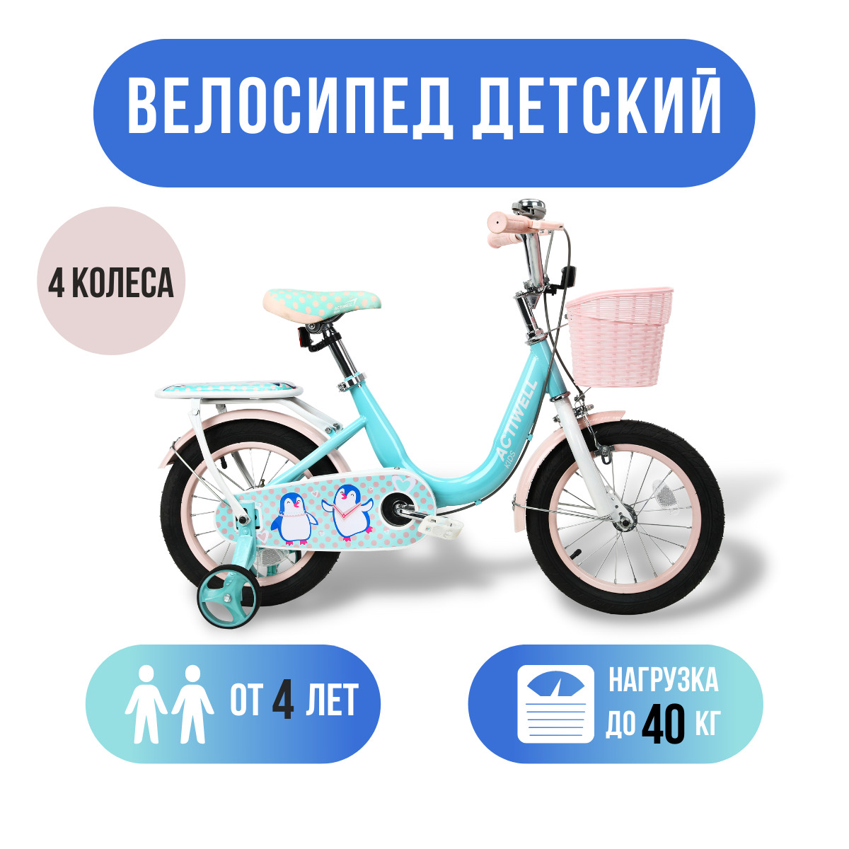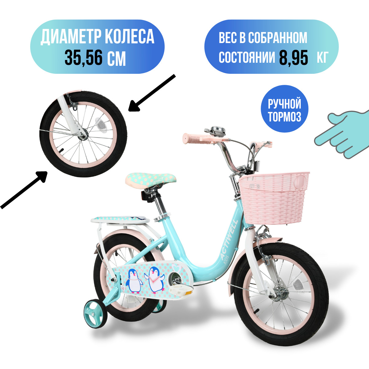 Велосипед детский ACTIWELL с корзиной мятно-розовый четырехколесный, диаметр колеса 14 дюймов
