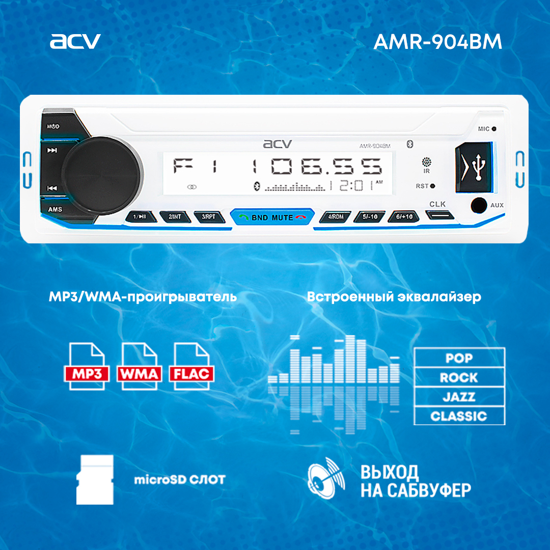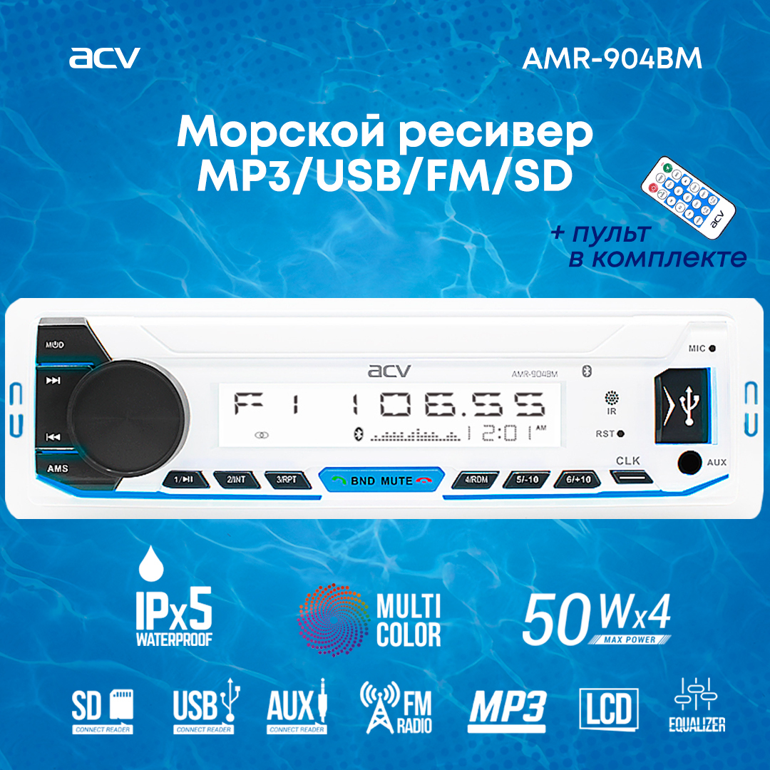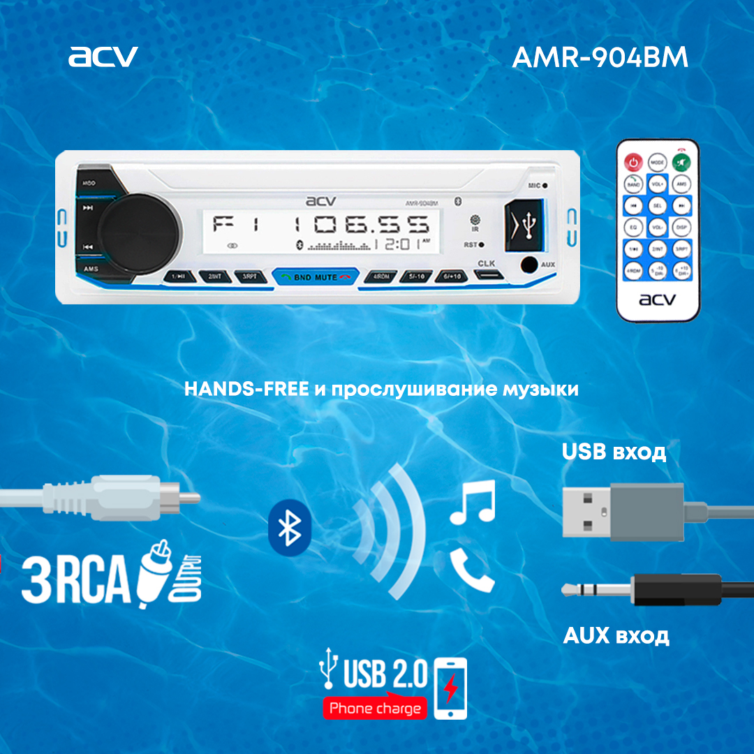 Магнитола для катера/яхты ACV AMR-902BS, морская серия, 3RCA, подсветка мультицвет