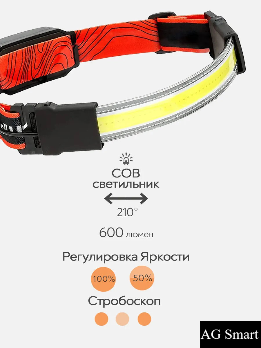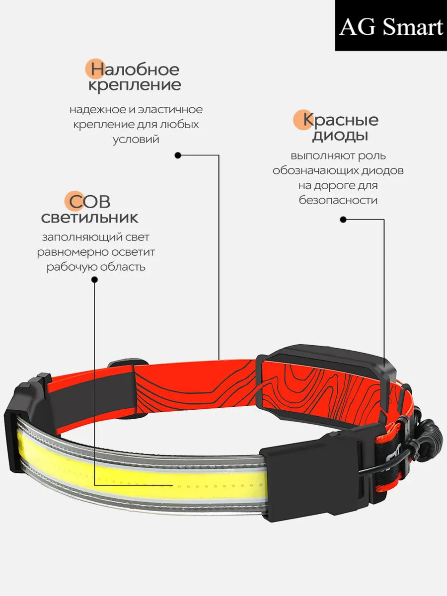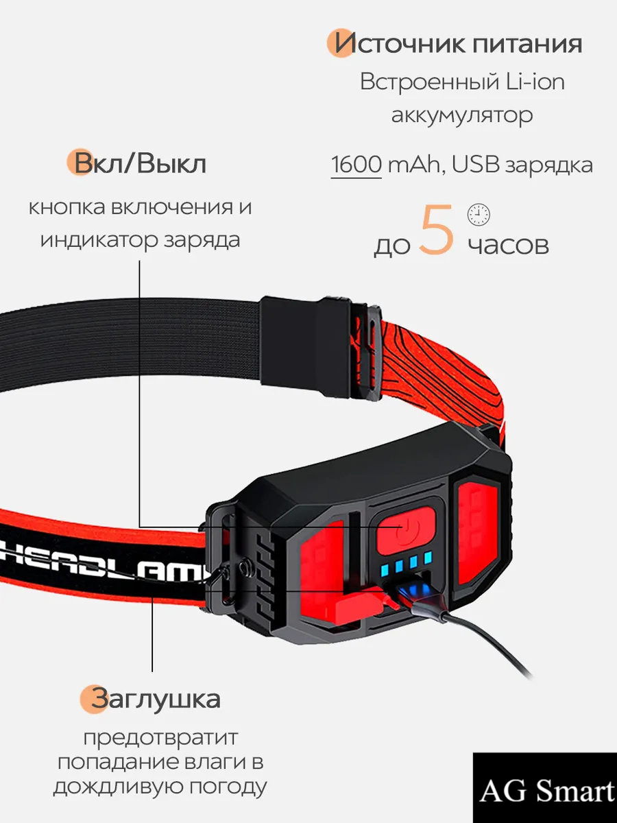 Налобный светодиодный фонарь AG Smart / Мощный светодиодный/ Фонарик аккумуляторный