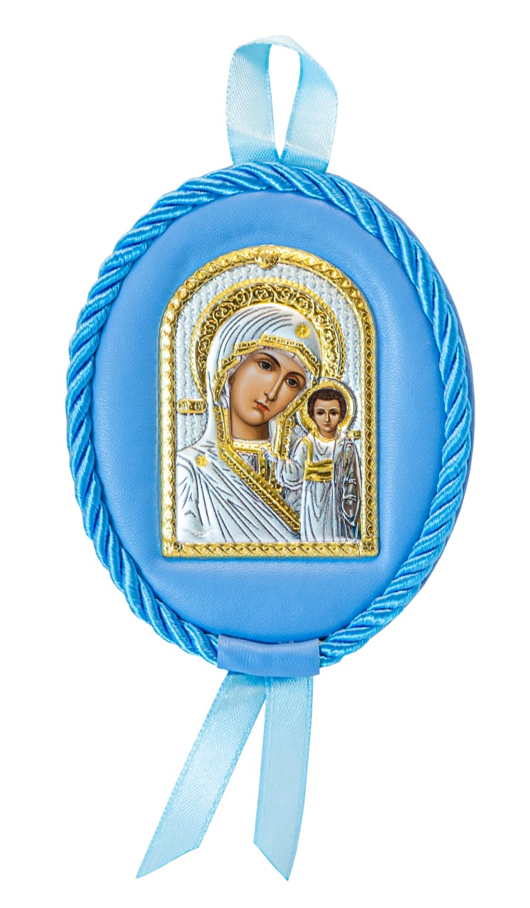 Икона детская, Казанская БМ, овальная, синяя кожа 7х9 см.