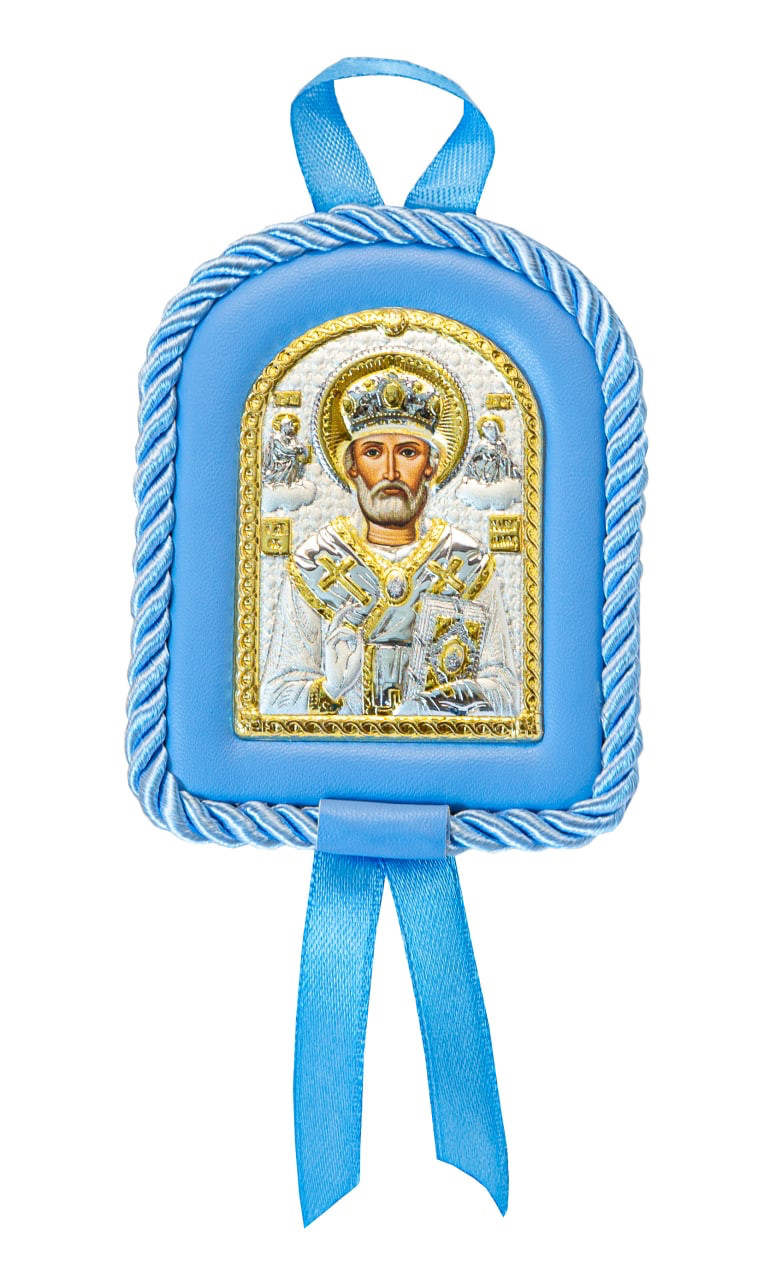 Икона детская, Николай Чудотворец , арочная, синяя кожа 7х9 см.