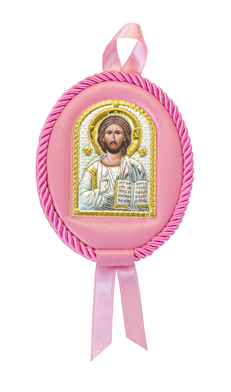 Икона детская, Спаситель, арочная, розовая кожа 7х9 см.