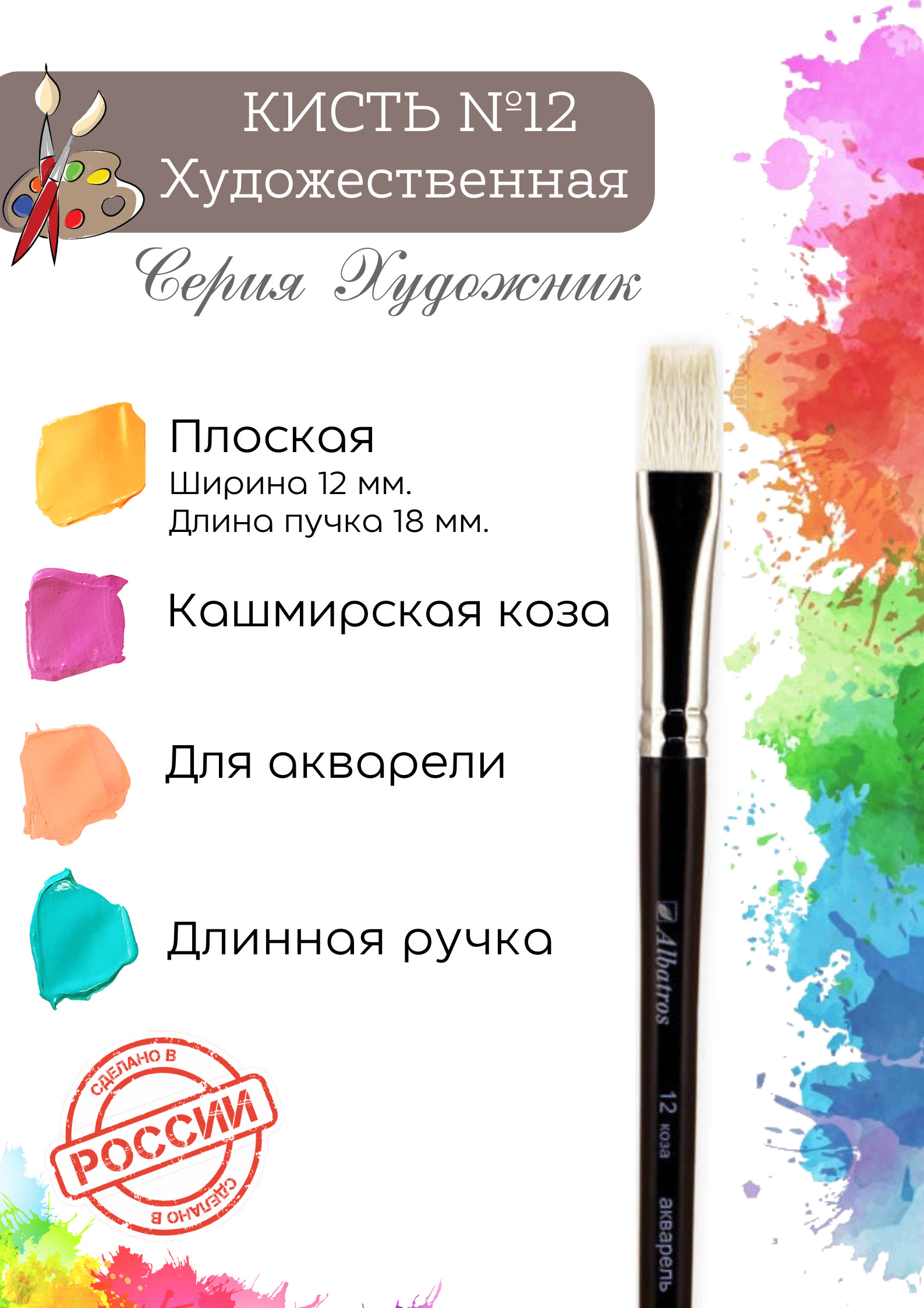 Кисть художественная Альбатрос серии "Художник" №12 из волоса козы, плоская