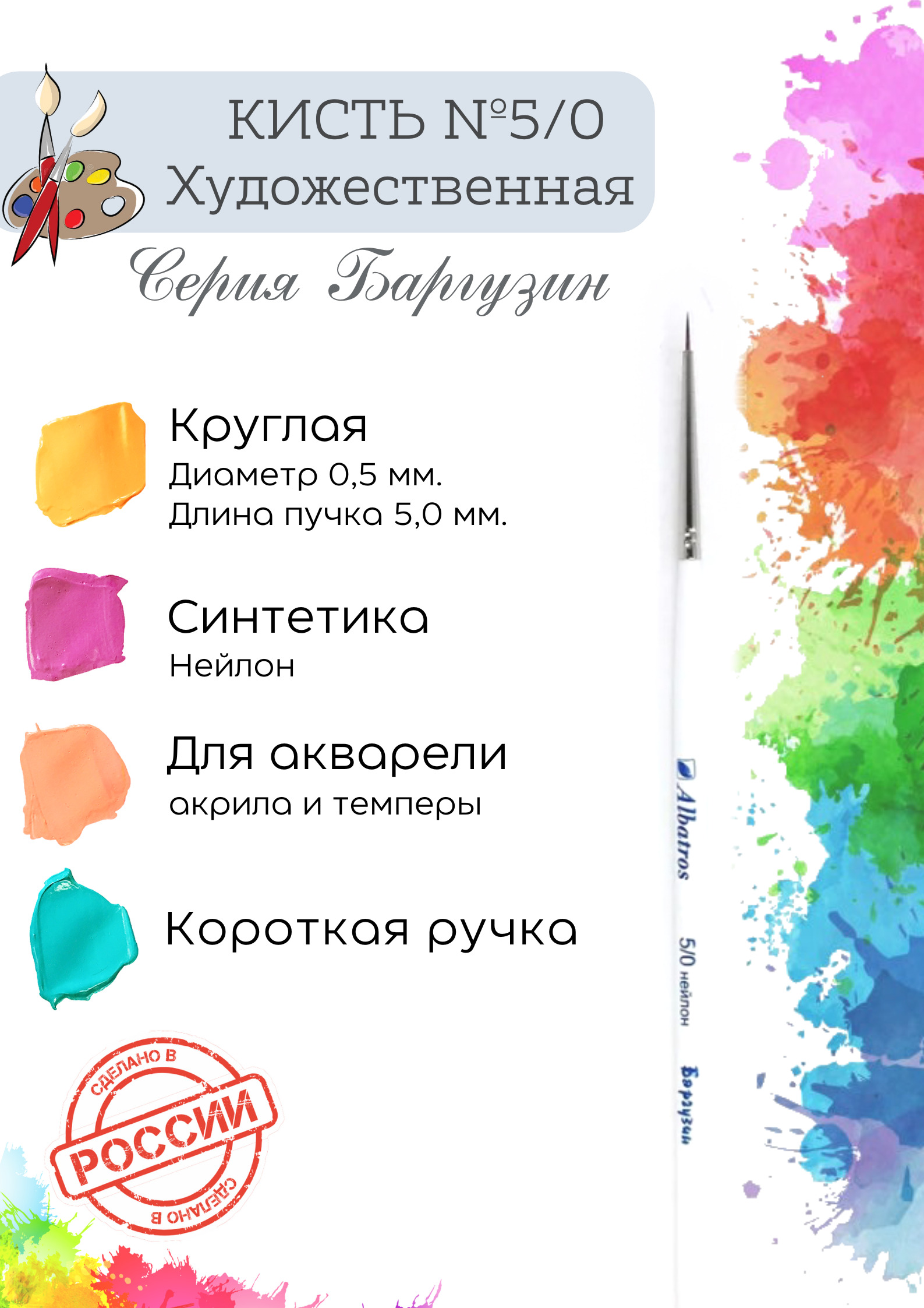 Кисть художественная Альбатрос "Баргузин" №5/0 круглая, синтетика