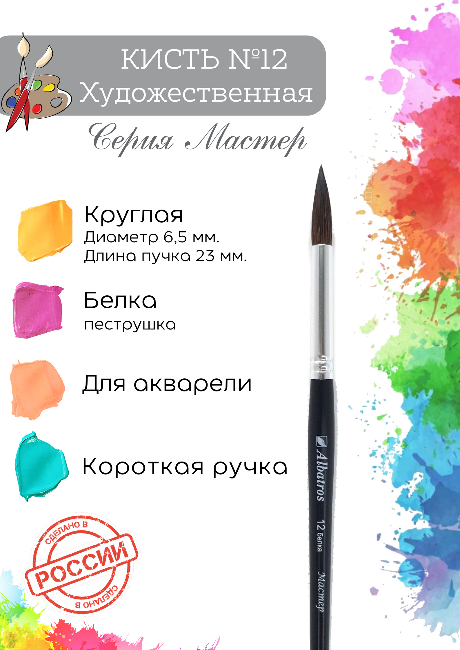 Кисть художественная Альбатрос "Мастер" №12 круглая, волос белки