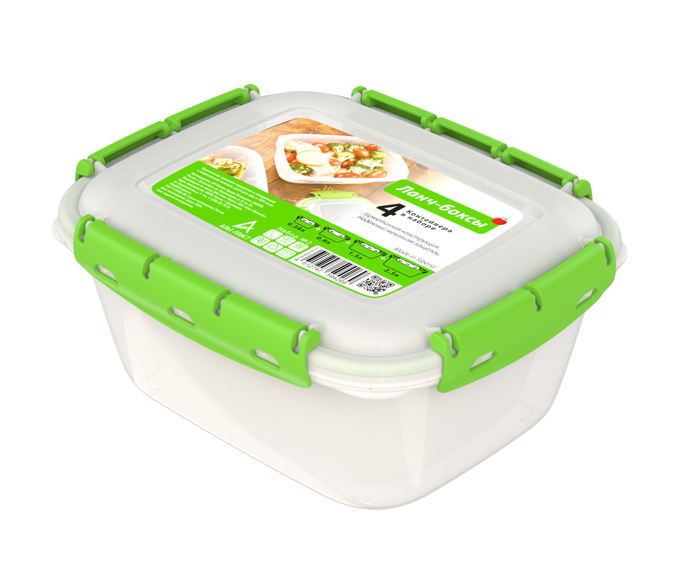 Набор контейнеров герметичных №2 (ланч-боксы, 4шт) (0,38л; 0,8л; 1,5л; 2,5л) в цветовом ассортименте