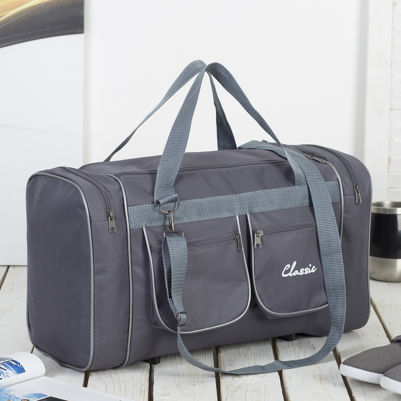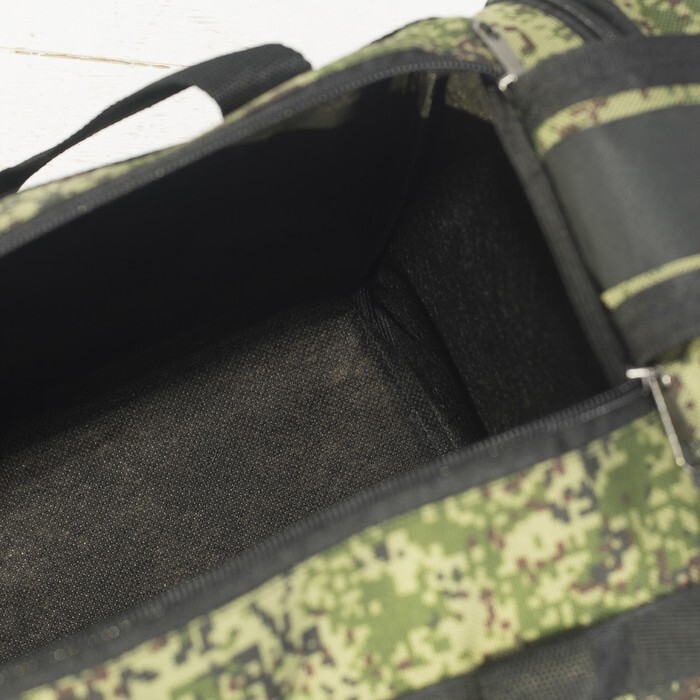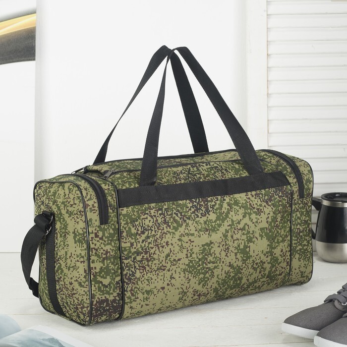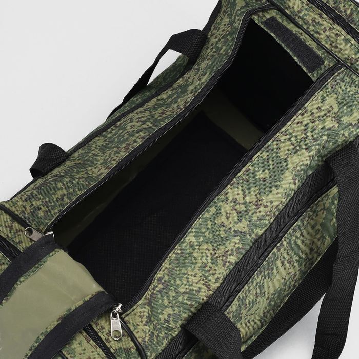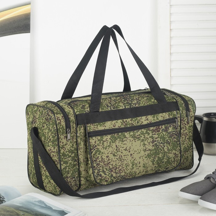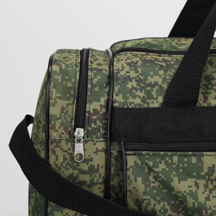Сумка дорожная на молнии, 3 наружных кармана, длинный ремень, цвет зелёный/камуфляж