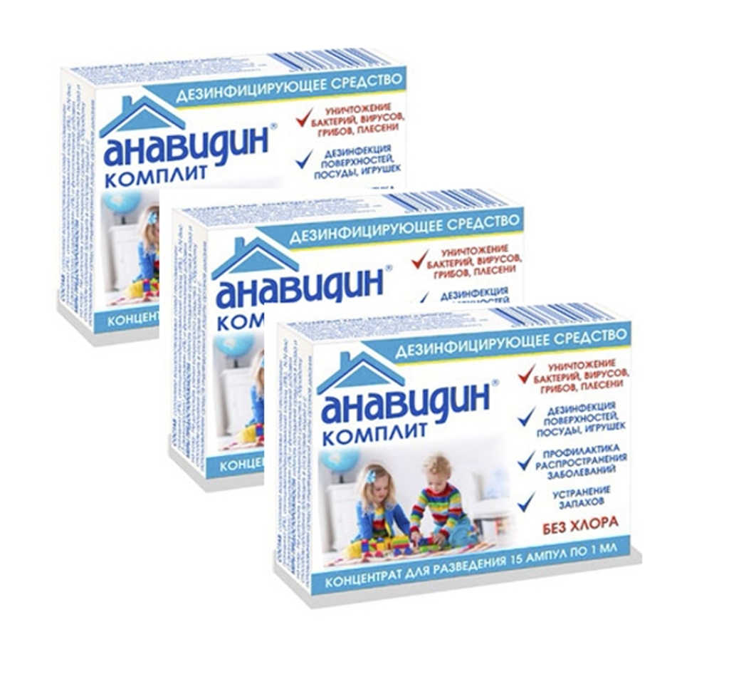 Дезинфицирующее средство с моющим эффектом без хлора без спирта "Анавидин-Комплит", 3 коробки (1мл*15шт в коробке).