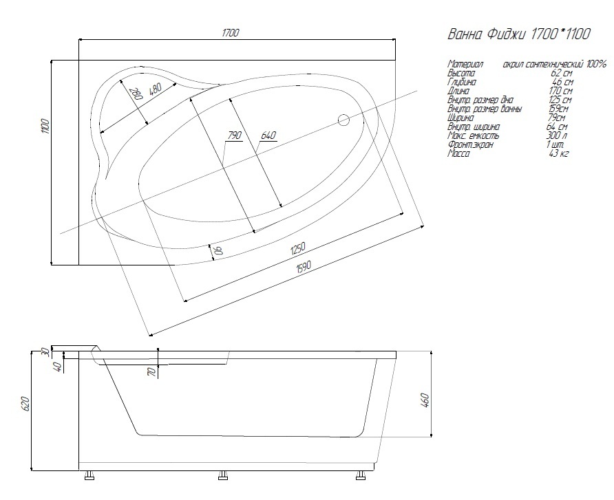 Ванна акриловая Aquatek Фиджи 170*110 правая пустая (вклеенный каркас)