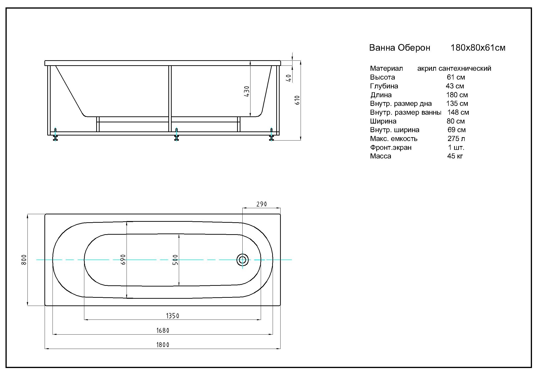 Ванна акриловая Aquatek Оберон 180 пустая с фронтальным экраном(слив слева, вклеенный каркас)