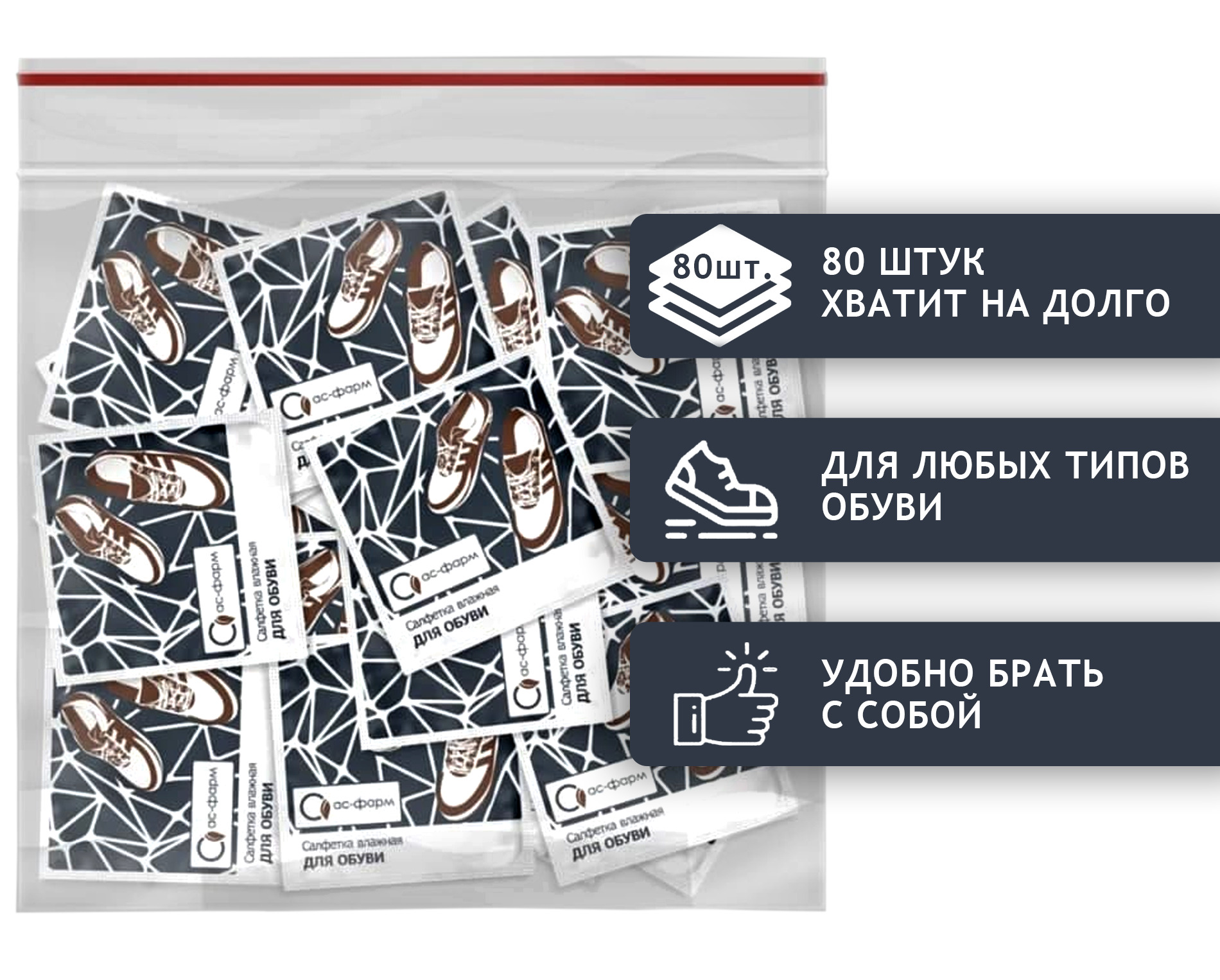Салфетки для обуви влажные (80 штук в зип-пакете)