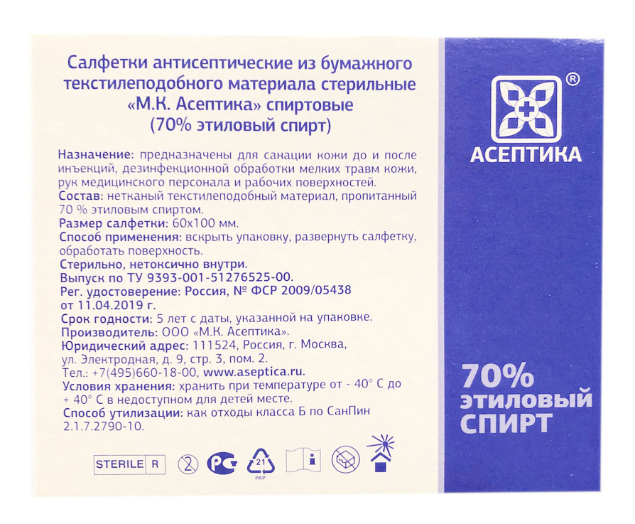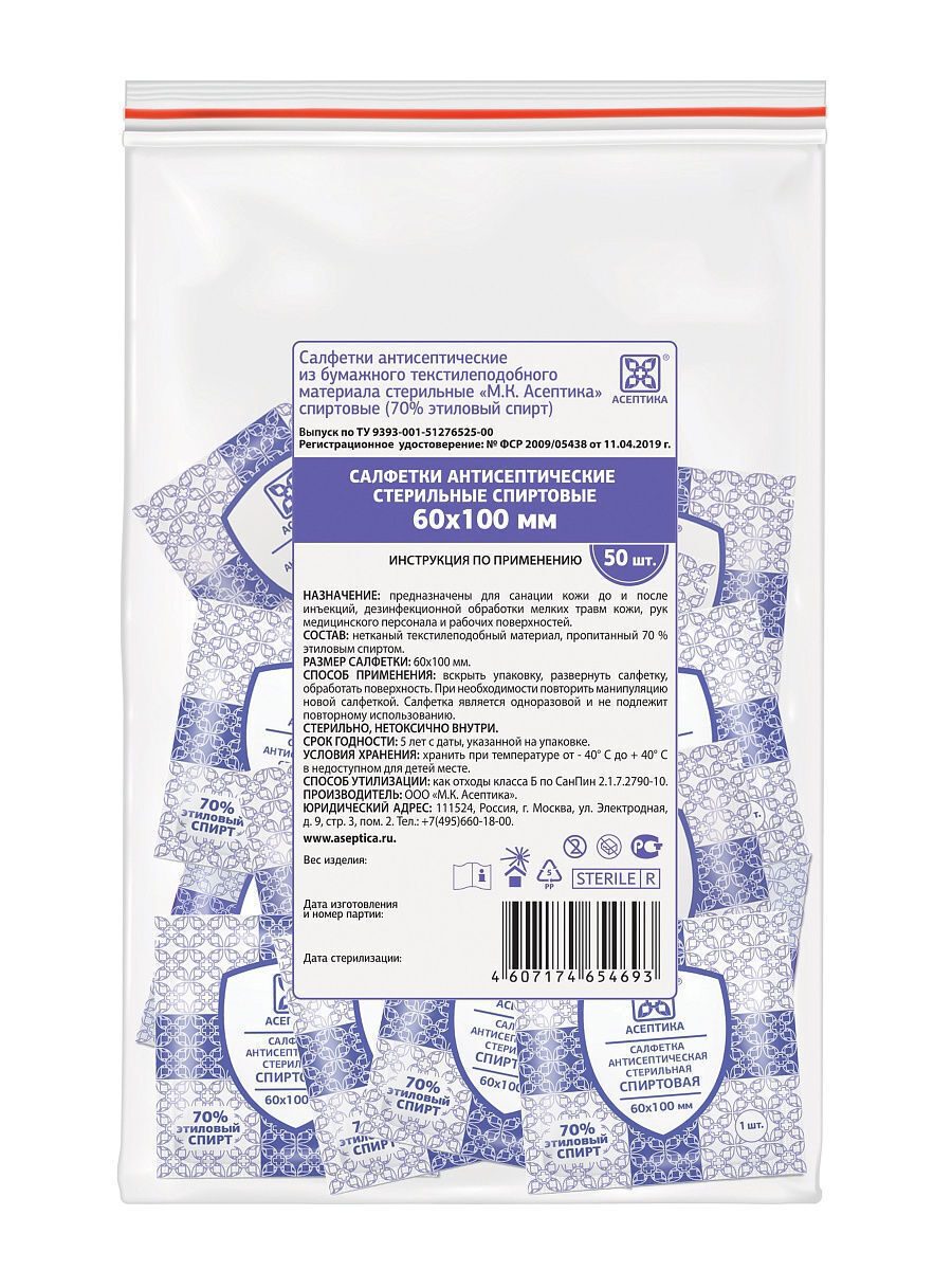 Салфетки антисептические спиртовые М.К. Асептика 200х250 мм, 60 шт