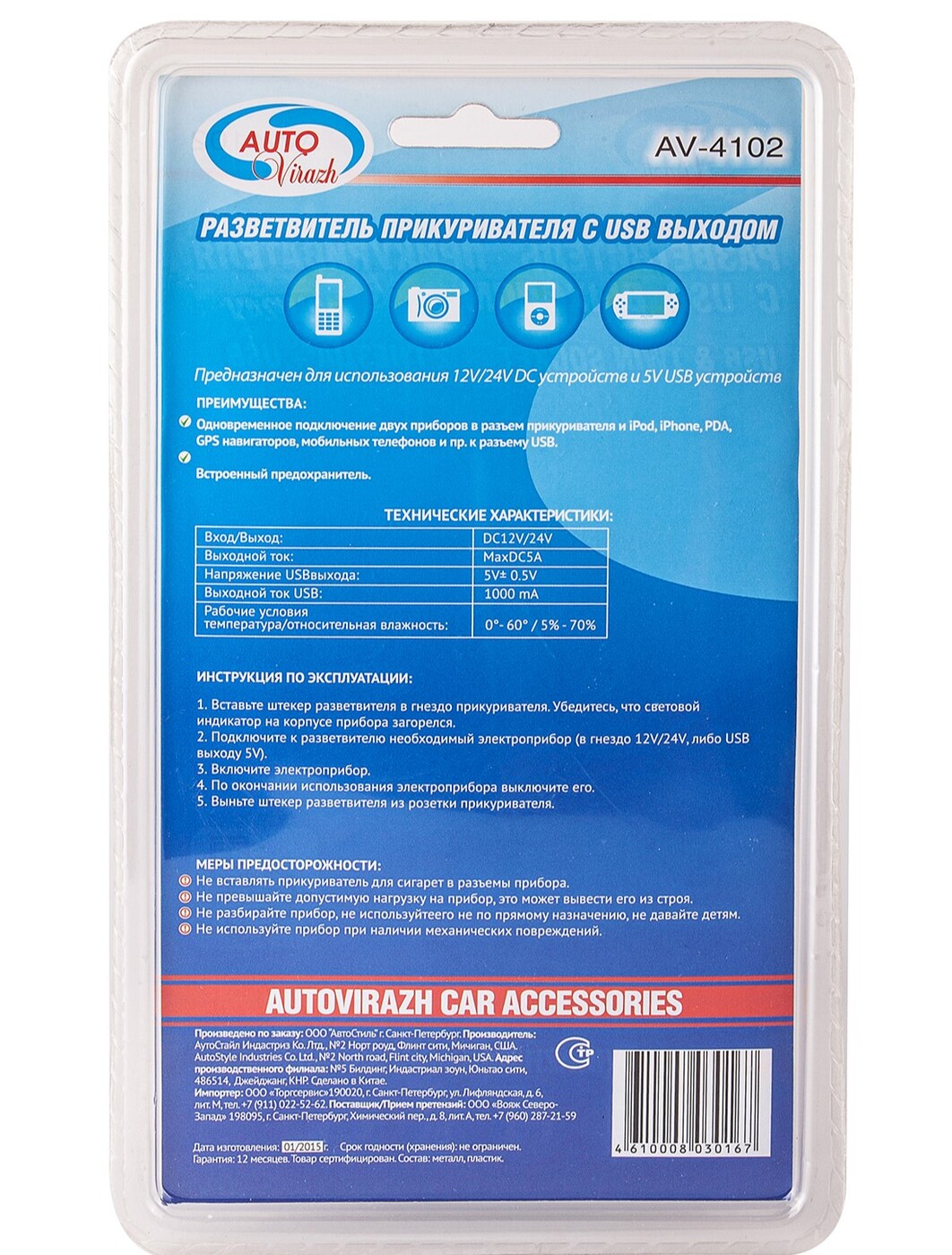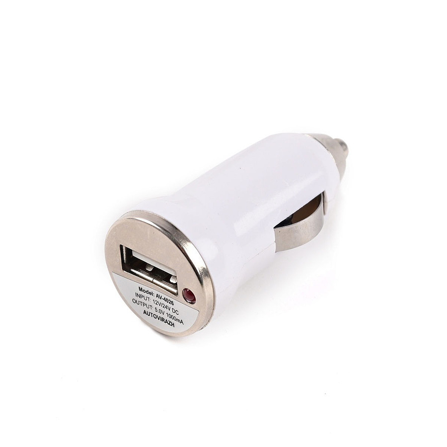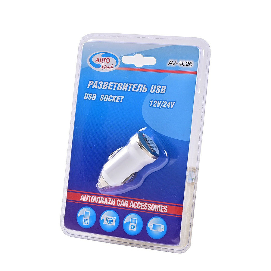 Прикуриватель разветвитель на 1 USB (12/24V) (зарядное устройство) белый AUTOVIRAZH AV-4026