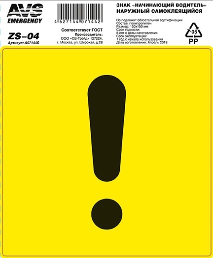 Знак "Начинающий водитель" ГОСТ наружная самоклеящийся AVS ZS-04 (150x150)