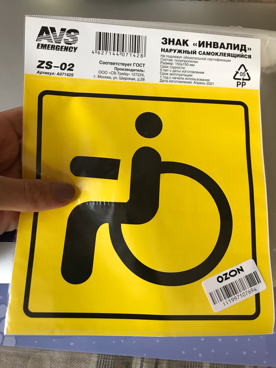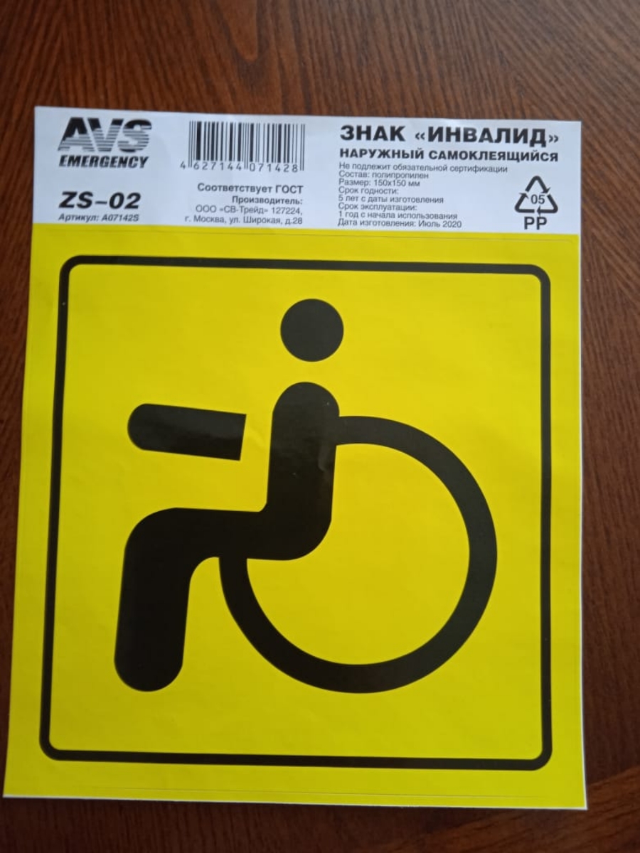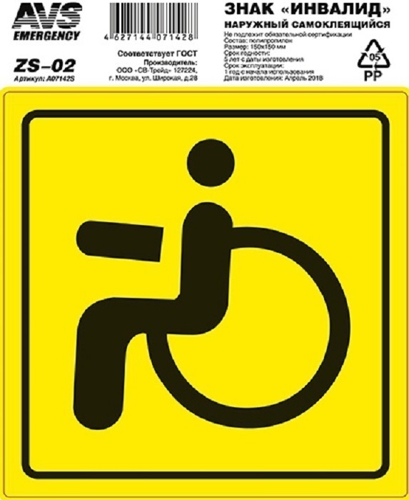 Знак Инвалид ГОСТ 150х150, наружный самоклеящийся, водостойкий AVS ZS-02