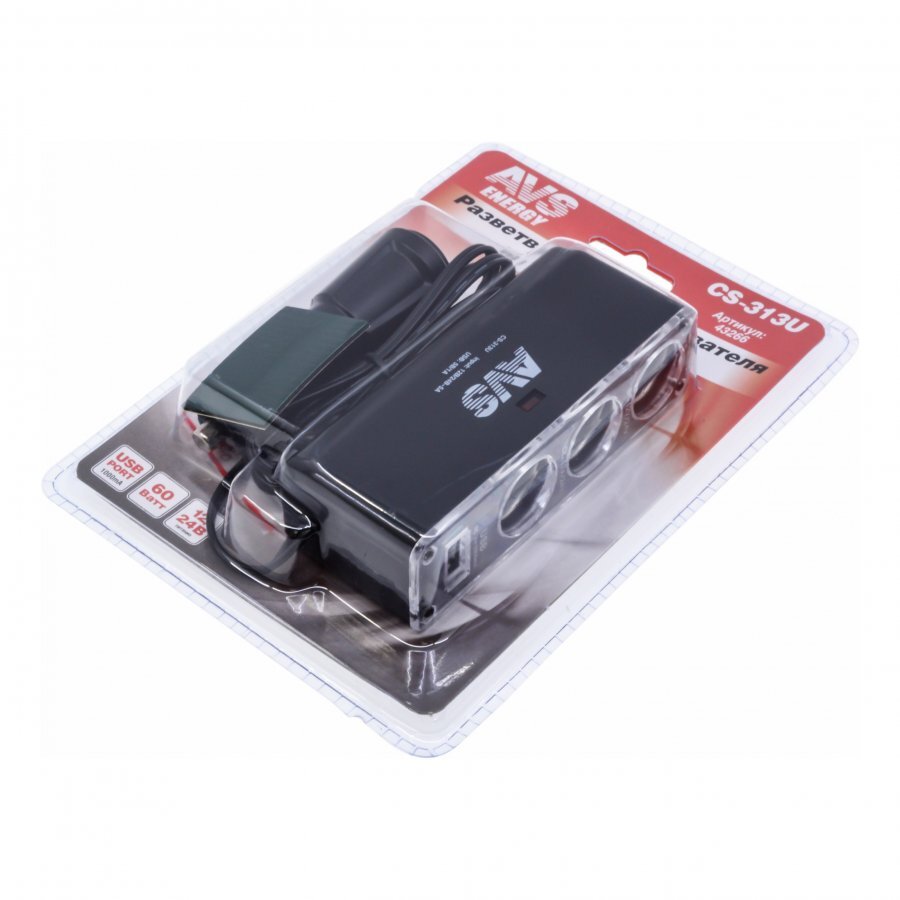Разветвитель прикуривателя AVS CS313U (3 выхода + USB), черный