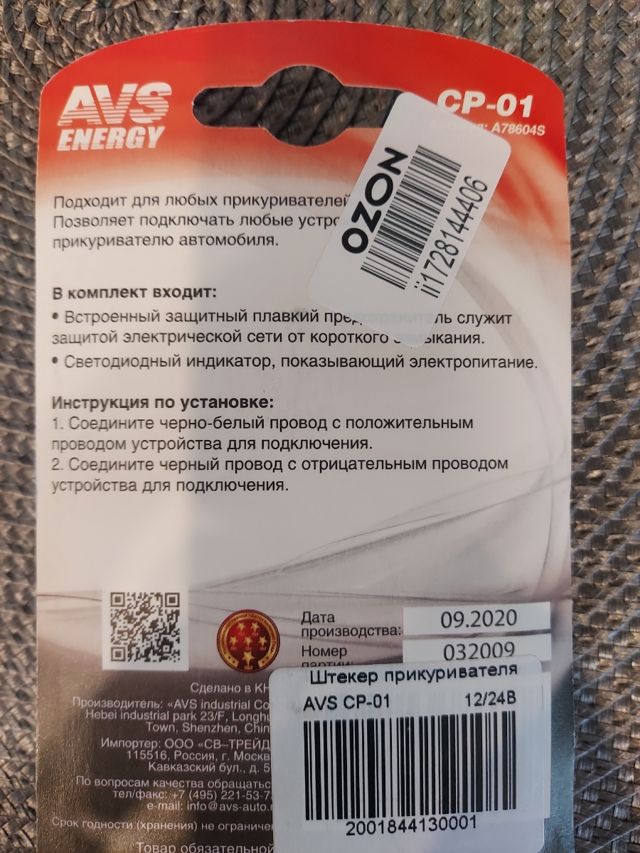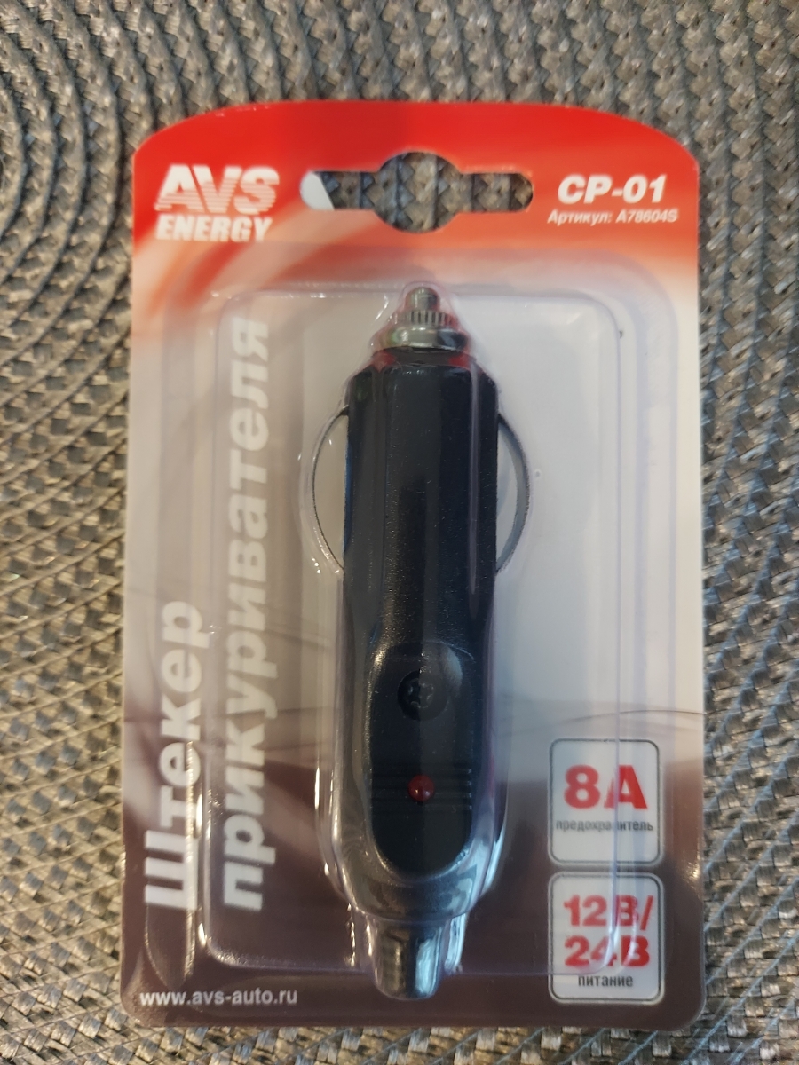 Штекер (вилка) для автомобильной розетки (прикуриватель), AVS CP-01, 12/24В, 8А
