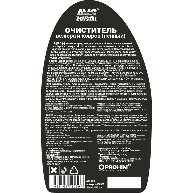 Очиститель велюра и ковров пенный (триггер) 500 мл AVS AVK-020