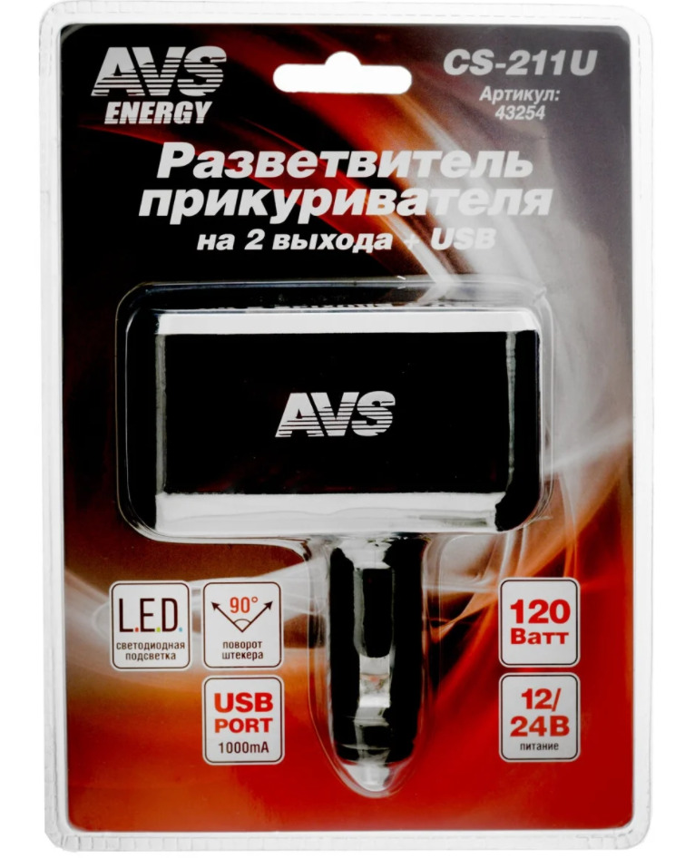 Разветвитель прикуривателя 12/24V (на 2 выхода + USB) AVS CS213U 43256