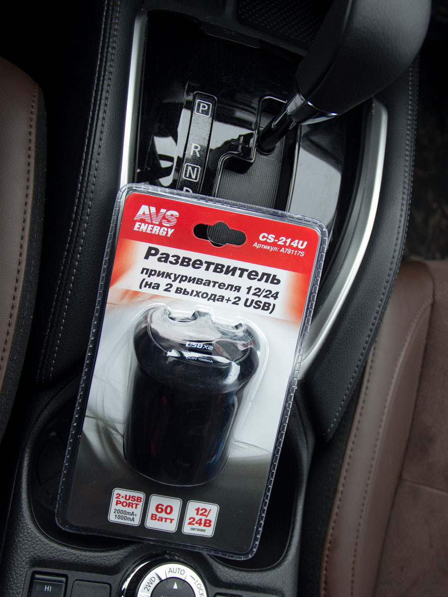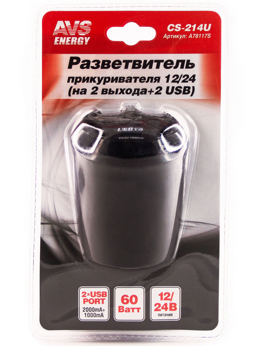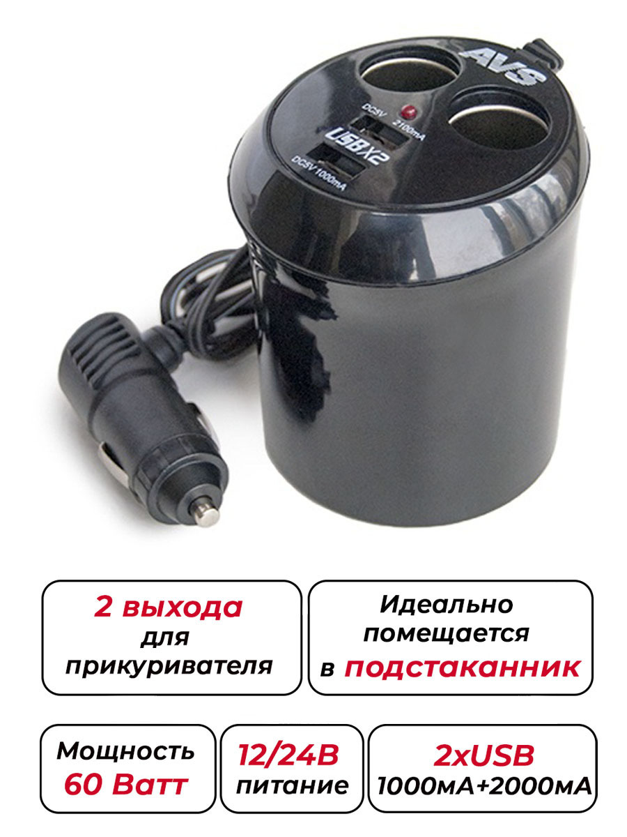 Разветвитель прикуривателя в подстаканник на 2 выхода + USB 12/24V AVS CS214U A78117S