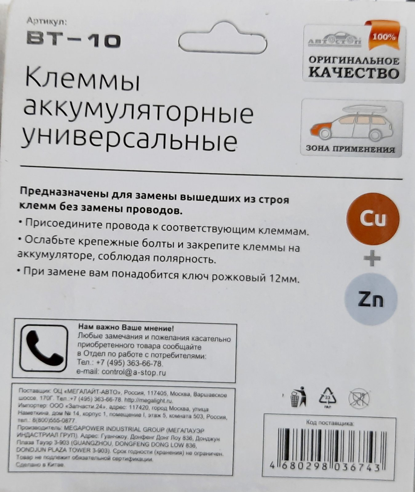 Клеммы аккумуляторные ВТ-10 медные+цинк