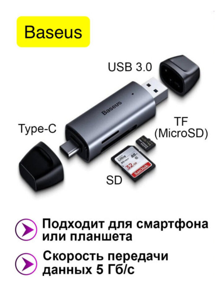 Хаб Картридер Baseus Lentil Cabin флешка USB + Type-C HUB (CADKQ-B0G)