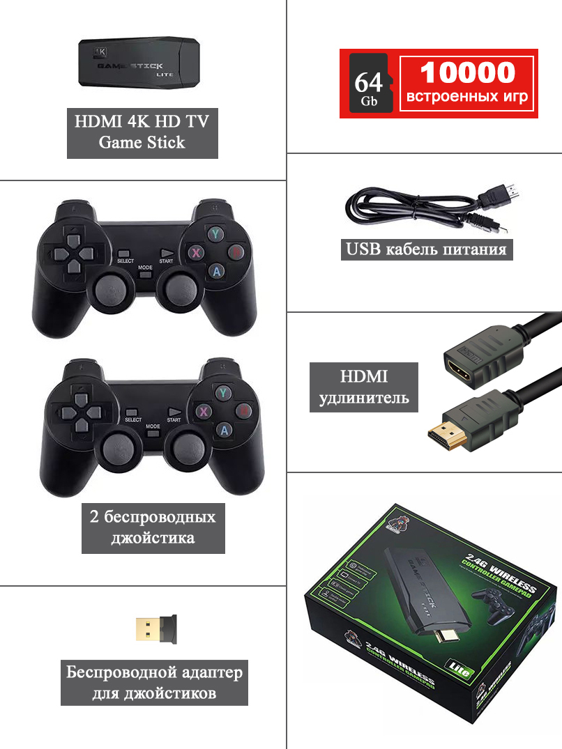 Портативная игровая приставка HDMI 4K HD TV Game Stick цифровая для телевизора/тв с Беспроводными джойстики Belgros, 10000 Ретро Игр, 64 ГБ