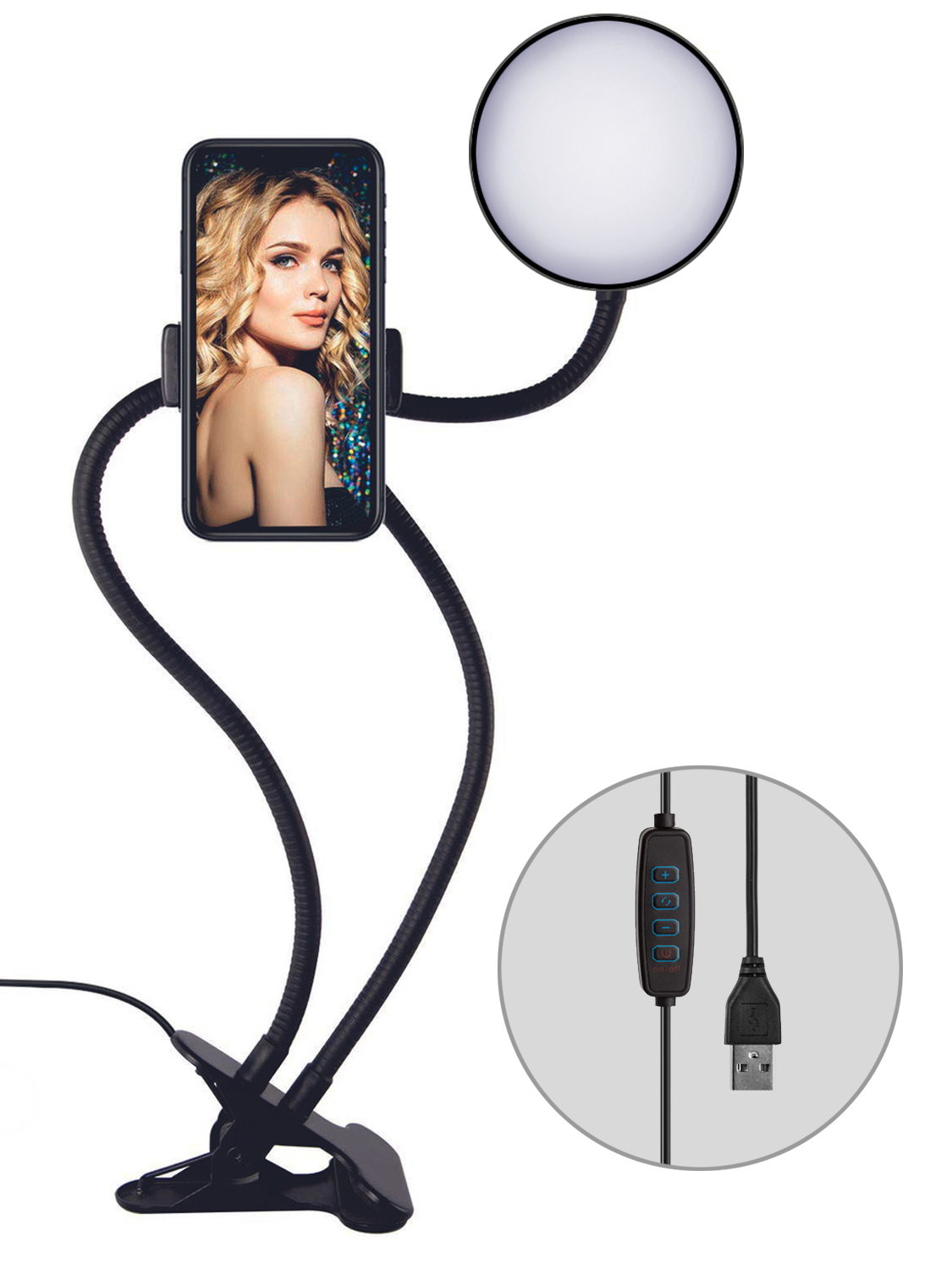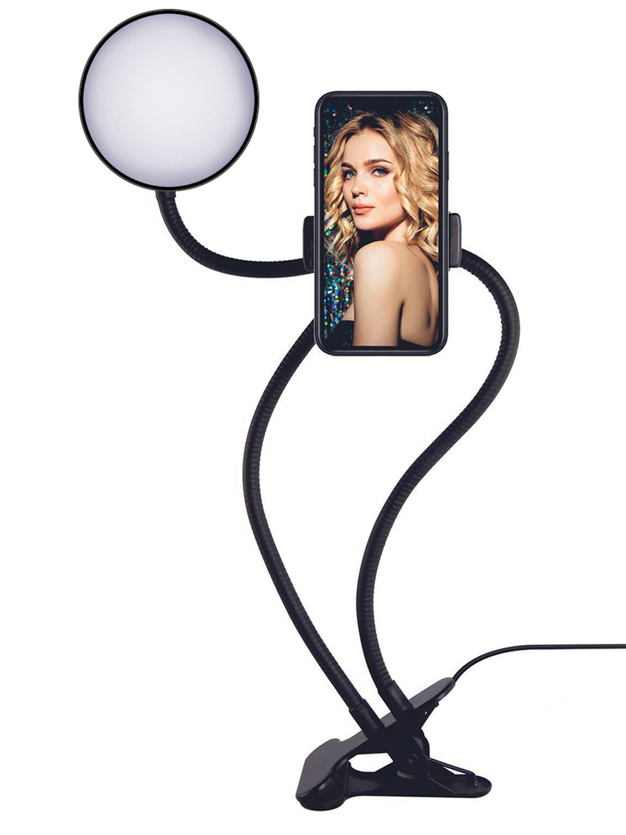 Кольцевая селфи лампа светодиодная LED SMD с гибким держателем для телефона на прищепке зажиме, селфи штатив, Belgros, чёрная
