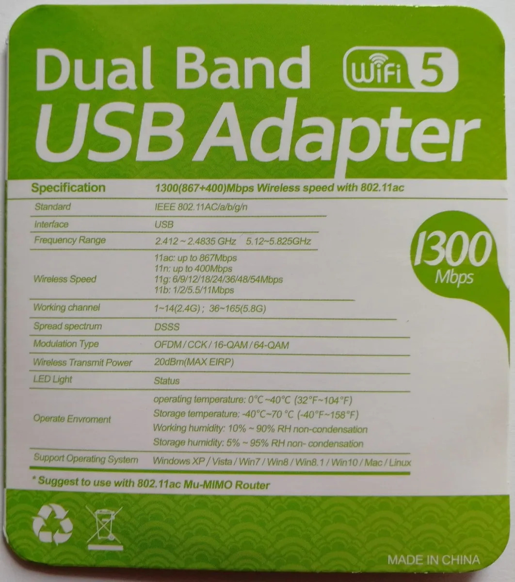 Wi-Fi адаптер 1300 Мбит / 2,4Ghz / 5,0Ghz / usb adapter / USB 3.0 / USB 2.0 / USB Wi-Fi 1300Mbit / s 802.11AC
