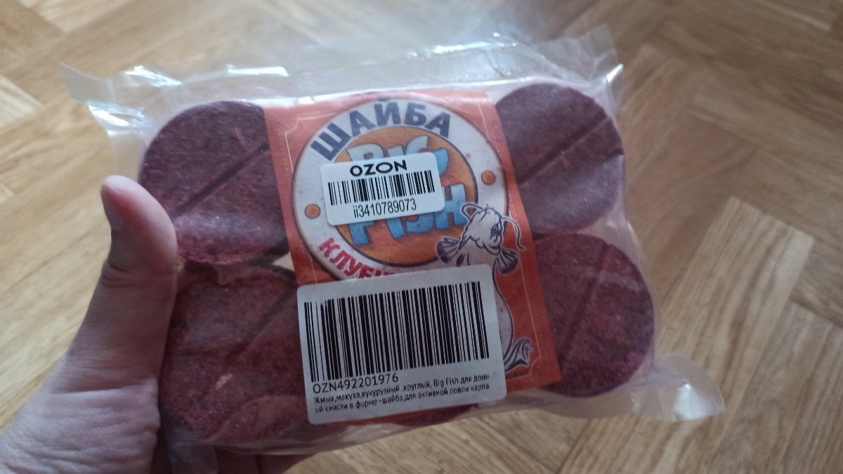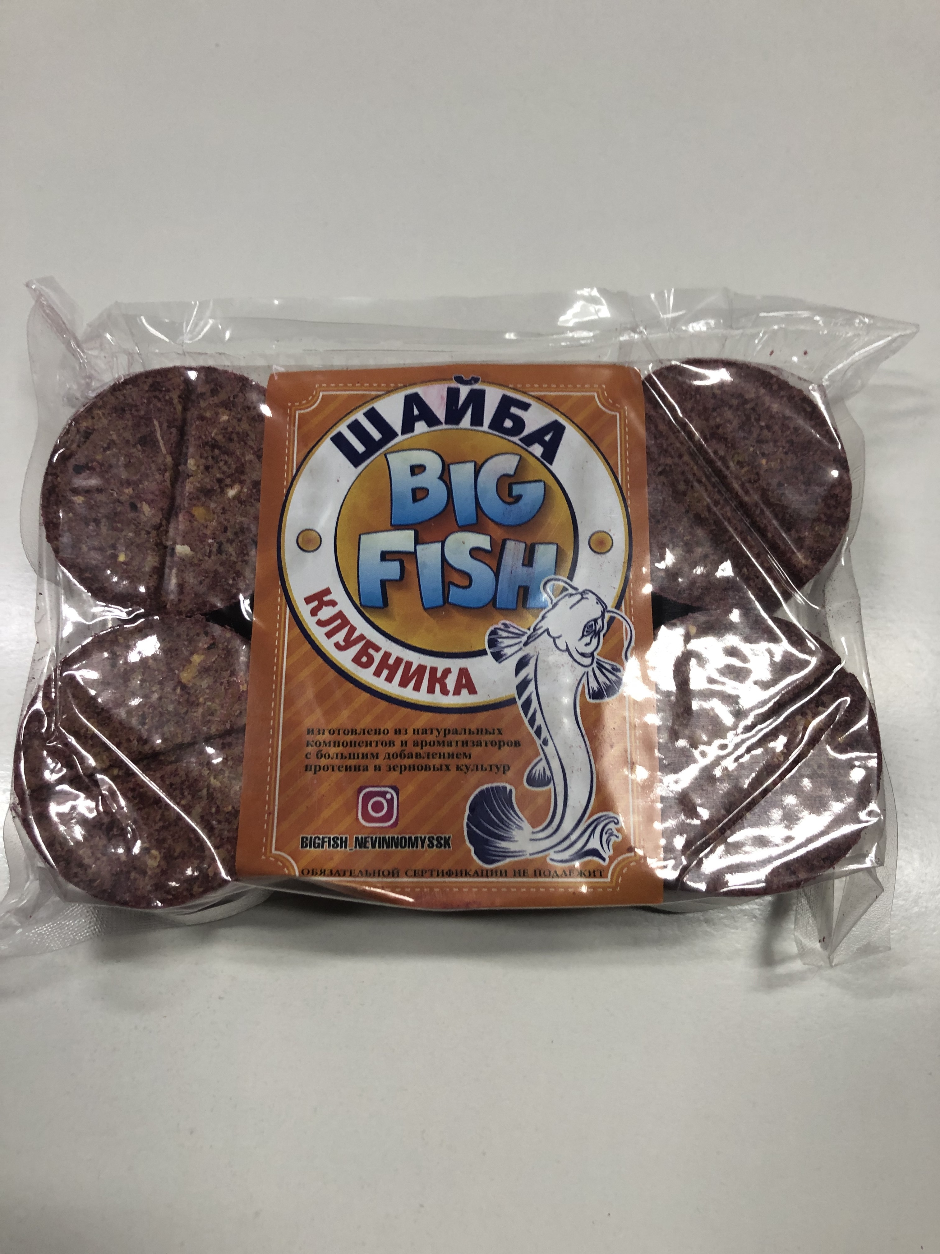 Жмых,макуха,кукурузный ,круглый, Big Fish для донной снасти в форме -шайба,для активной ловли карпа и сазана.С ароматом-КЛУБНИКА.Вес-477 гр