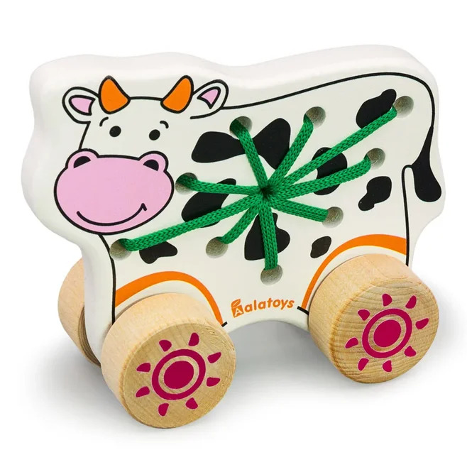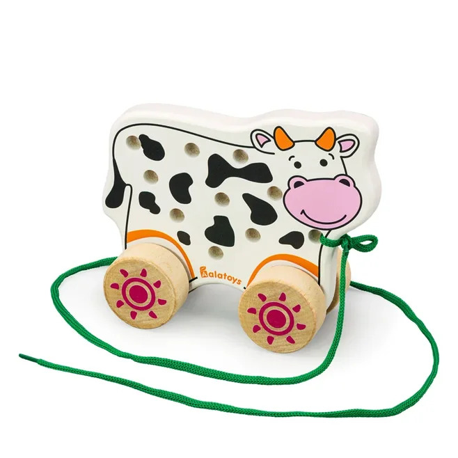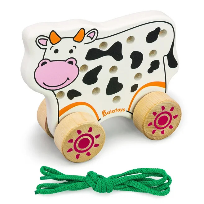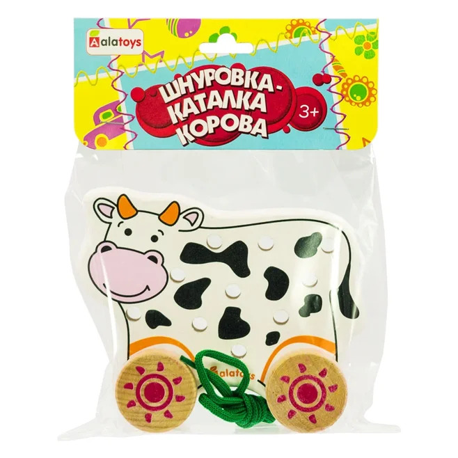 Игрушка для детей интерактивная развивающая Шнуровка-каталка Коровка (деревянная)