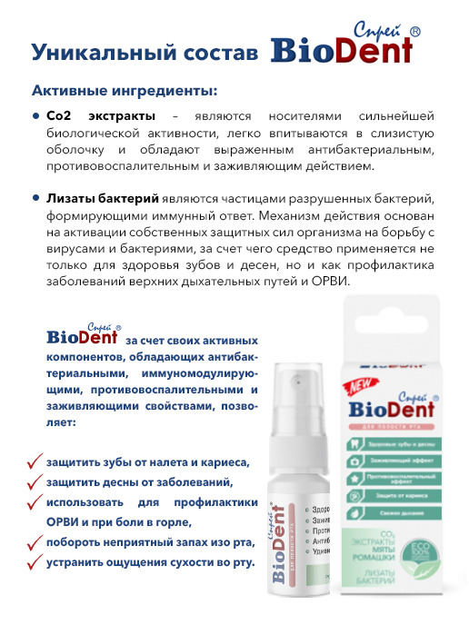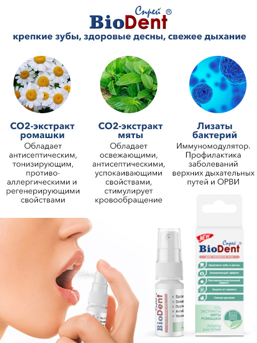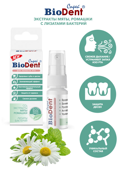 Биодент Спрей для полости рта с экстрактами ромашки и мяты и лизатами бактерий 15 мл
