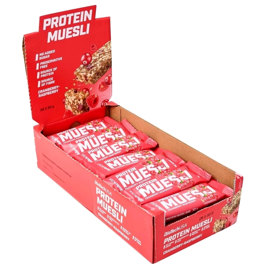 Злаковый батончик с протеином BiotechUSA Protein Muesli 30 г. клюква-малина (шоубокс - 28 шт)