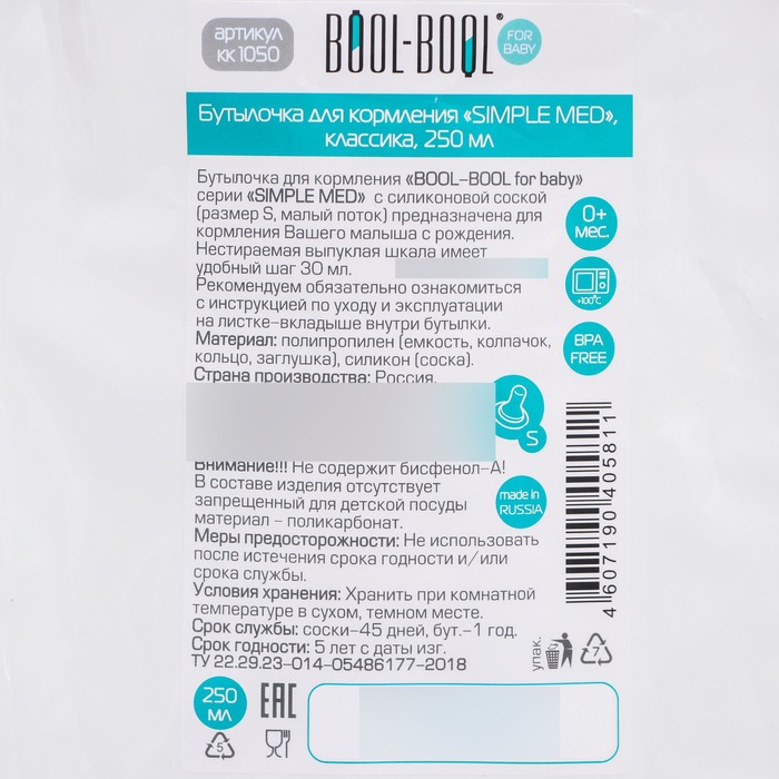 Бутылочка для кормления SIMPLE MED, классика, 250 мл., от 0 мес., медленный поток