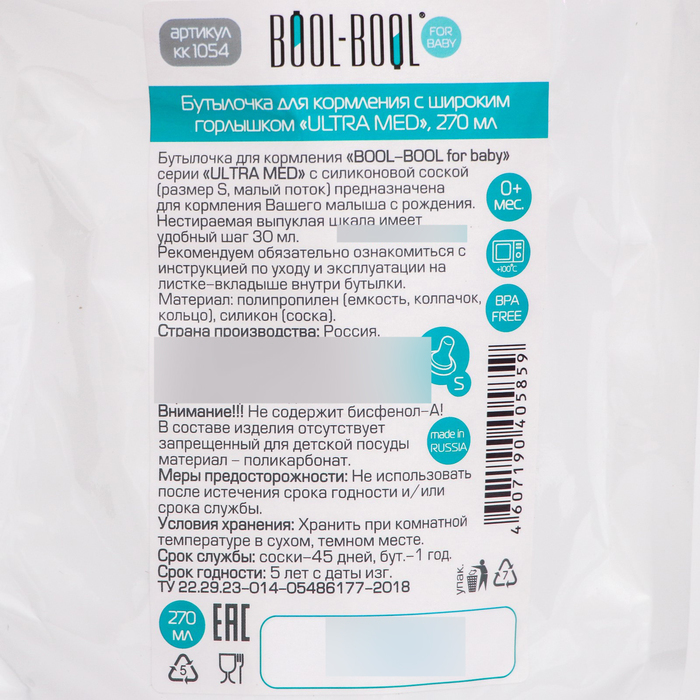 Бутылочка для кормления, широкое горло, ULTRA MED, 270 мл., от 0 мес., медленный поток