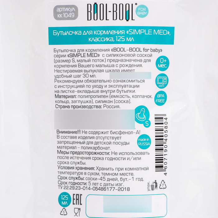 Бутылочка для кормления SIMPLE MED, классика, 125 мл., от 0 мес., медленный поток