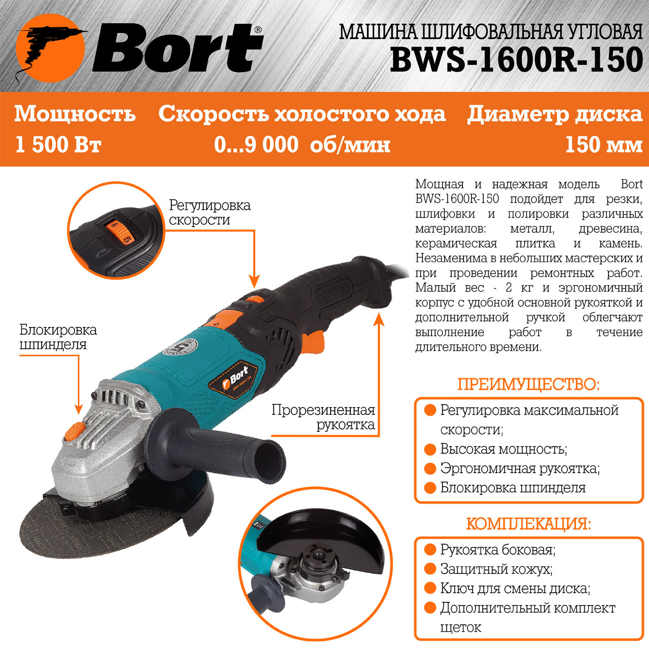 Машина шлифовальная угловая Bort BWS-1600R-150