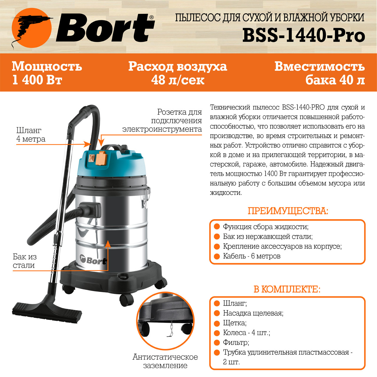 Строительный пылесос Bort BSS-1440-PRO 40 л, 1400 Вт