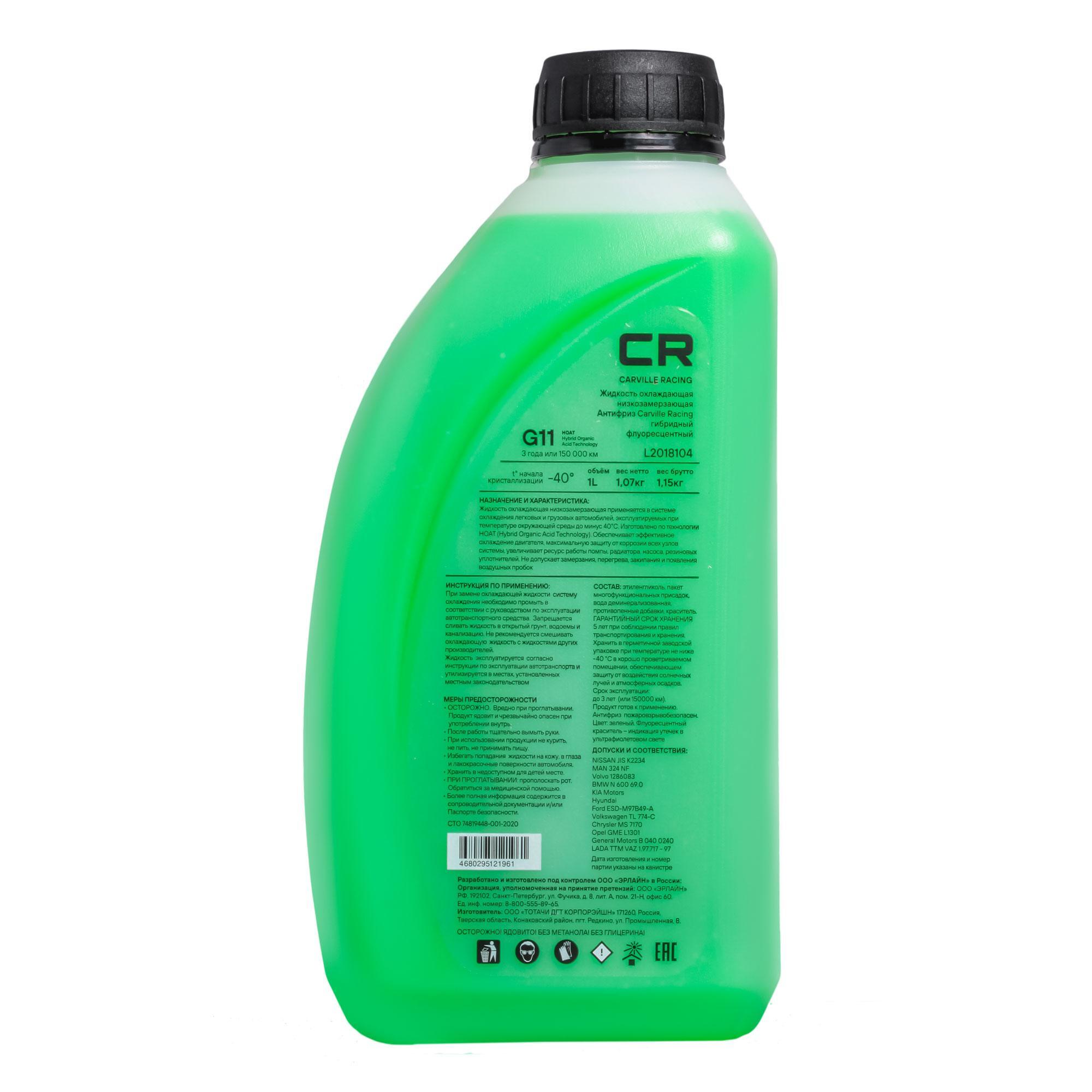 Антифриз Carville Racing гибридный флуоресцентный 40 С, G11, 1л/1.07кг CARVILLE RACING L2018104