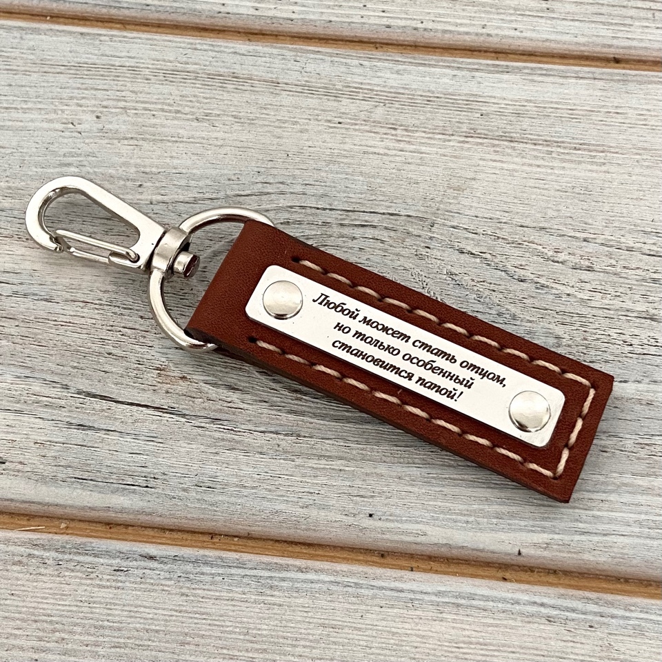 Брелок из натуральной кожи ручной работы с лазерной гравировкой "Любой может стать отцом...". Коньяк 2 см