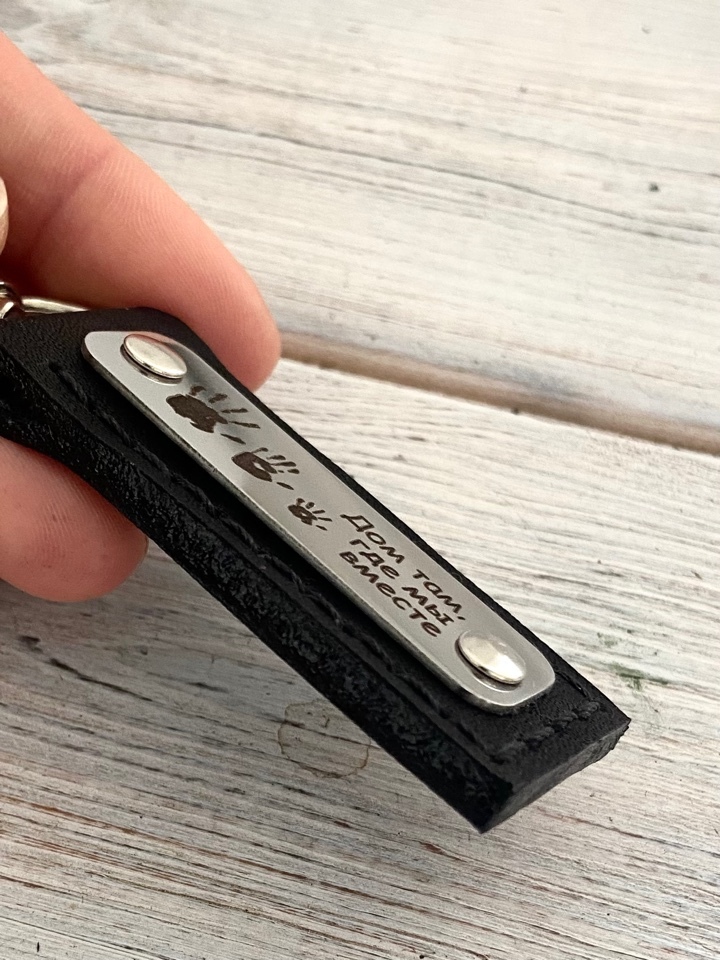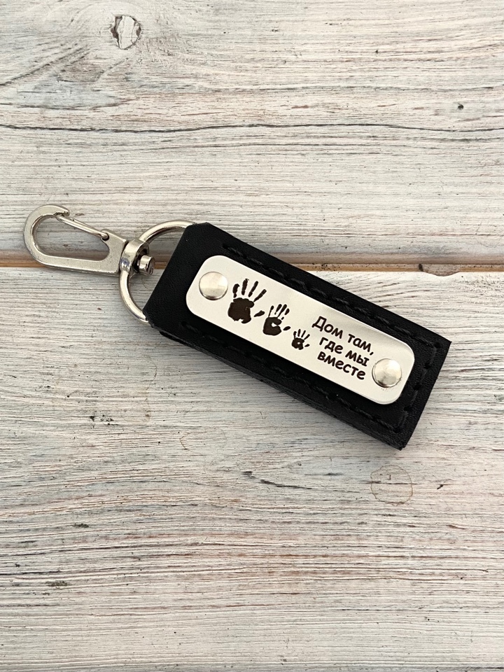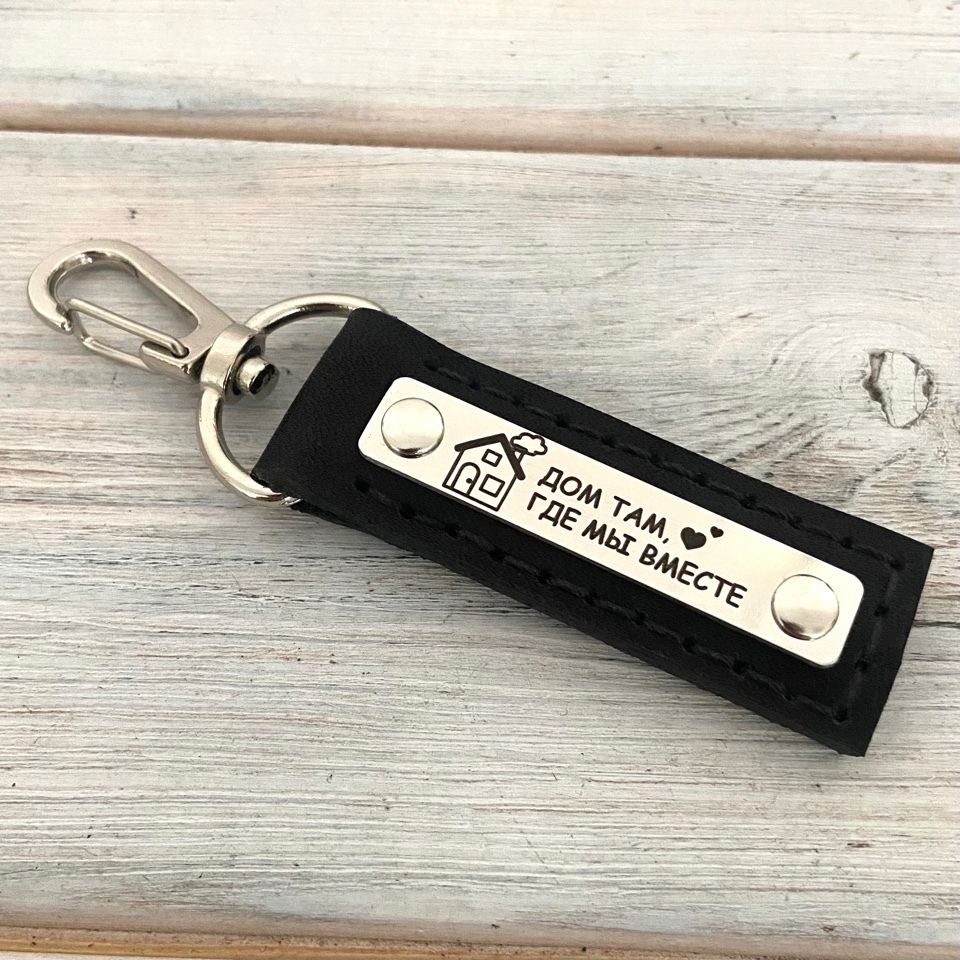 Брелок из натуральной кожи ручной работы с лазерной гравировкой "Дом там, где мы вместе". Чёрный 2 см