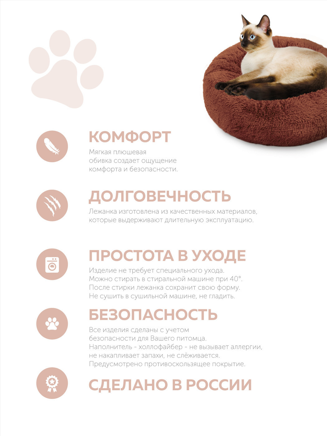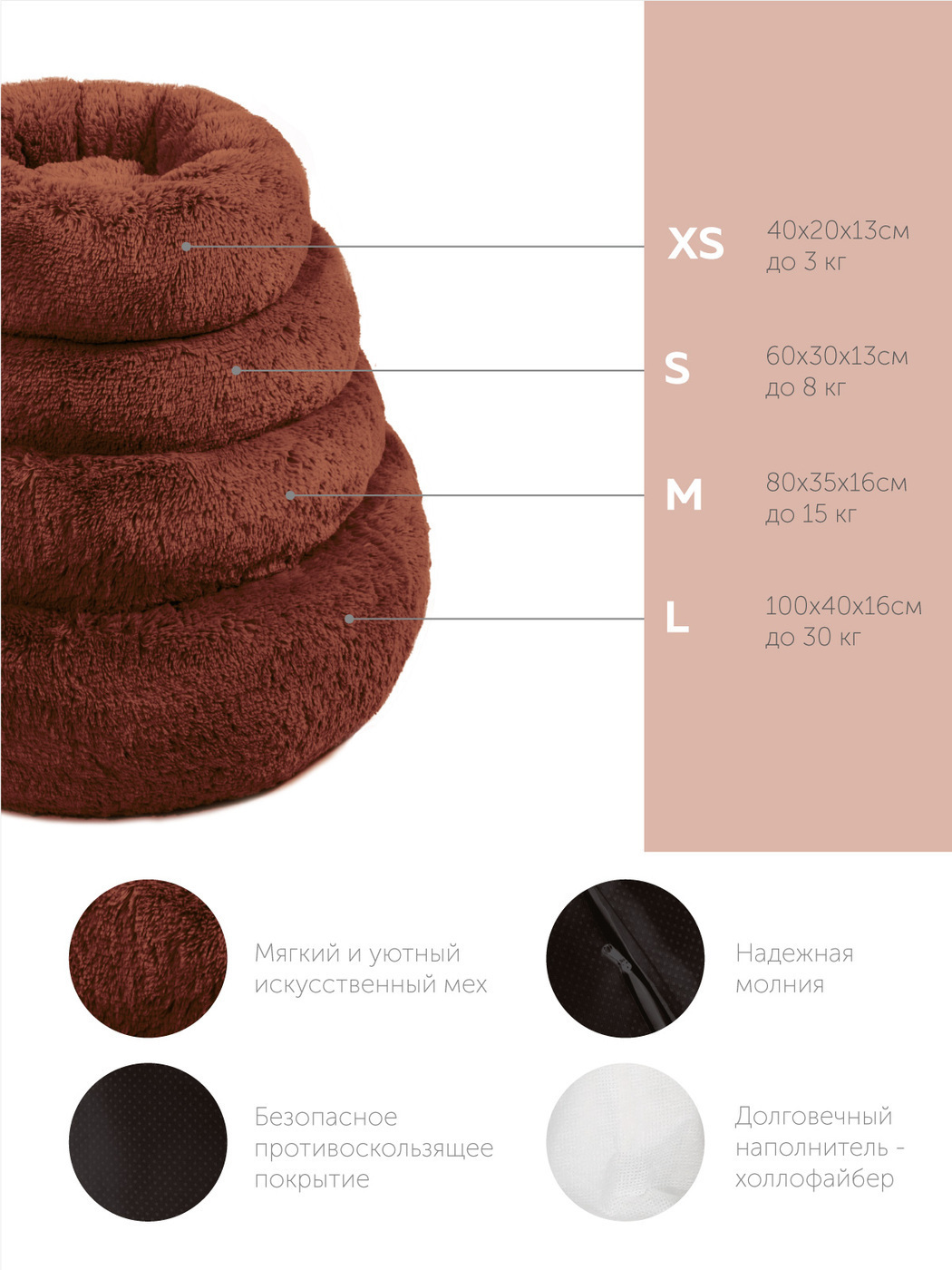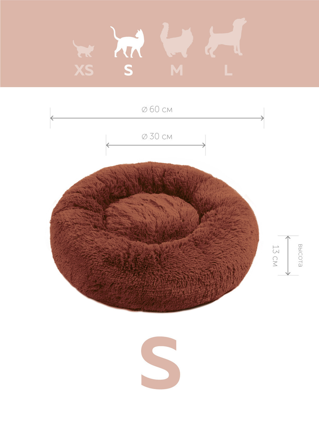Пушистая лежанка d50 см +-5 см для средних кошек и собак цвет шоколадный артикул PNL60