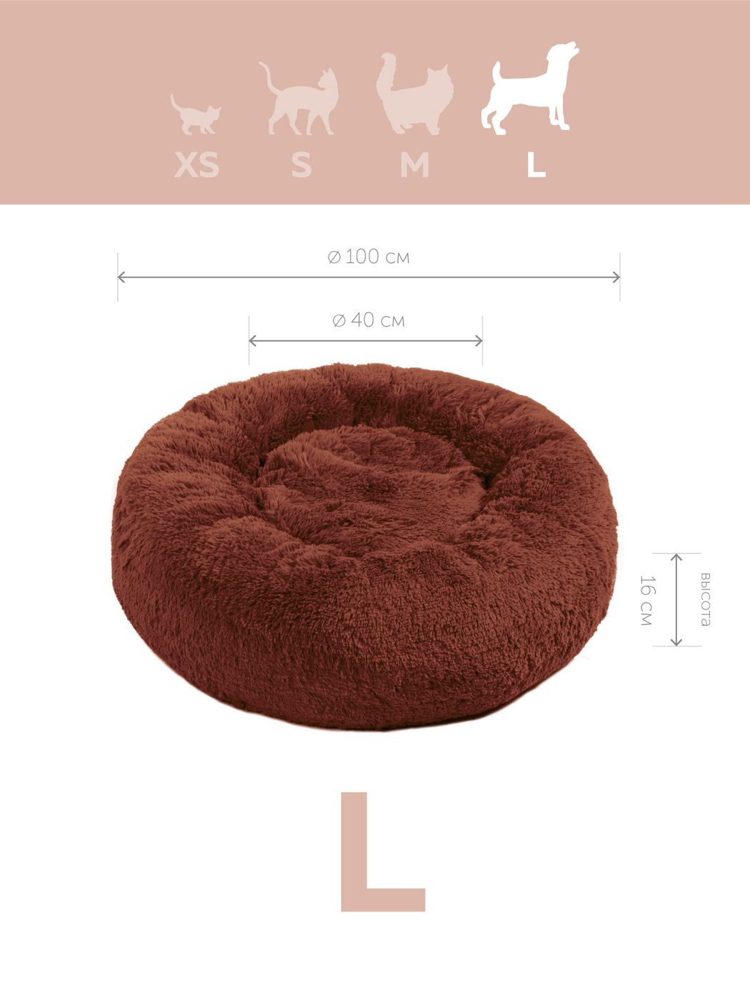 Пушистая лежанка d90 см +-5 см для собак и кошек цвет шоколадный артикул PNL100