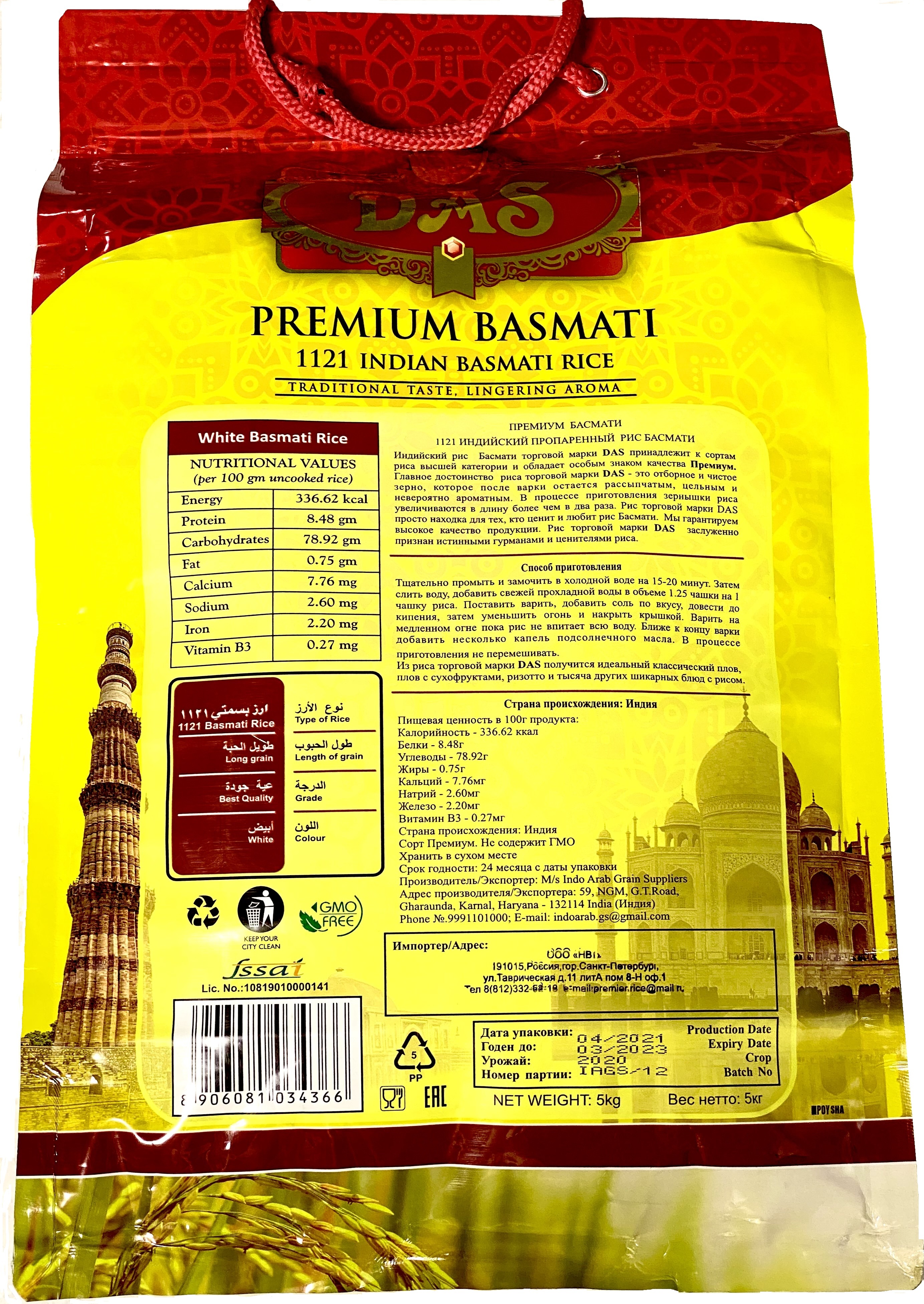 Рис индийский басмати DAS PREMIUM NEW длиннозерный пропаренный для плова 5 кг упаковка зип-пакет