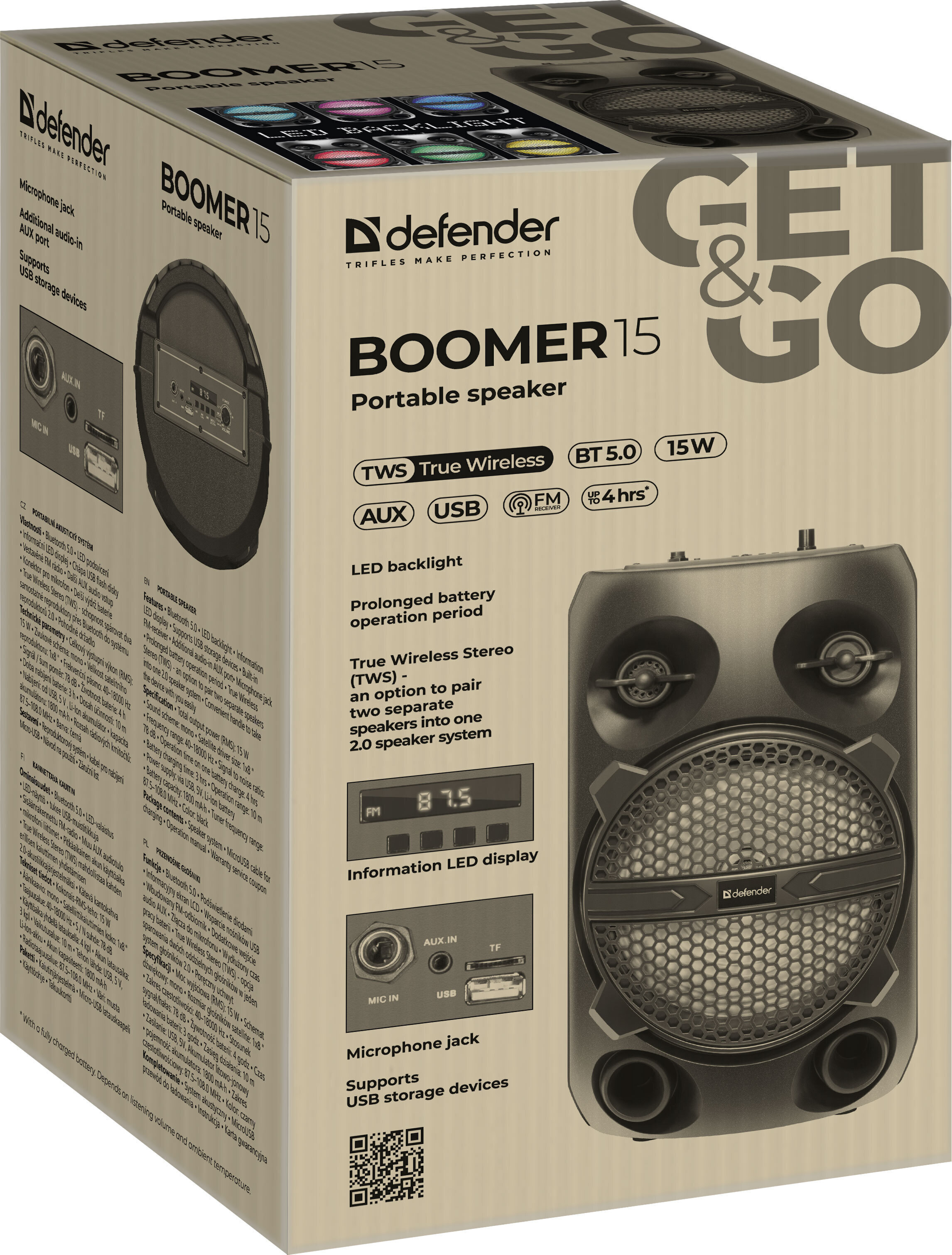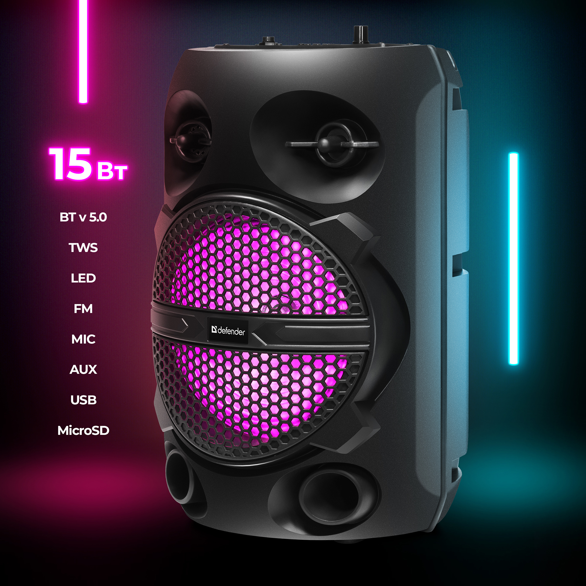 Колонка портативная / беспроводная колонка Defender Boomer 15Вт, BT/FM/USB/TF/AUX/Light
