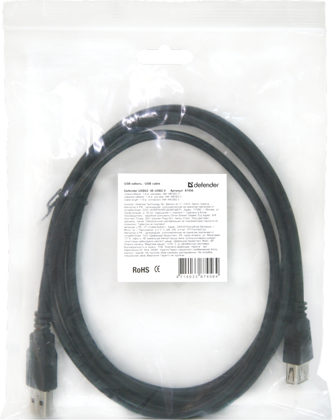 Кабель Defender, USB Type-A (M) - USB Type-A (F), ver. 2.0, 1.8 м, черный