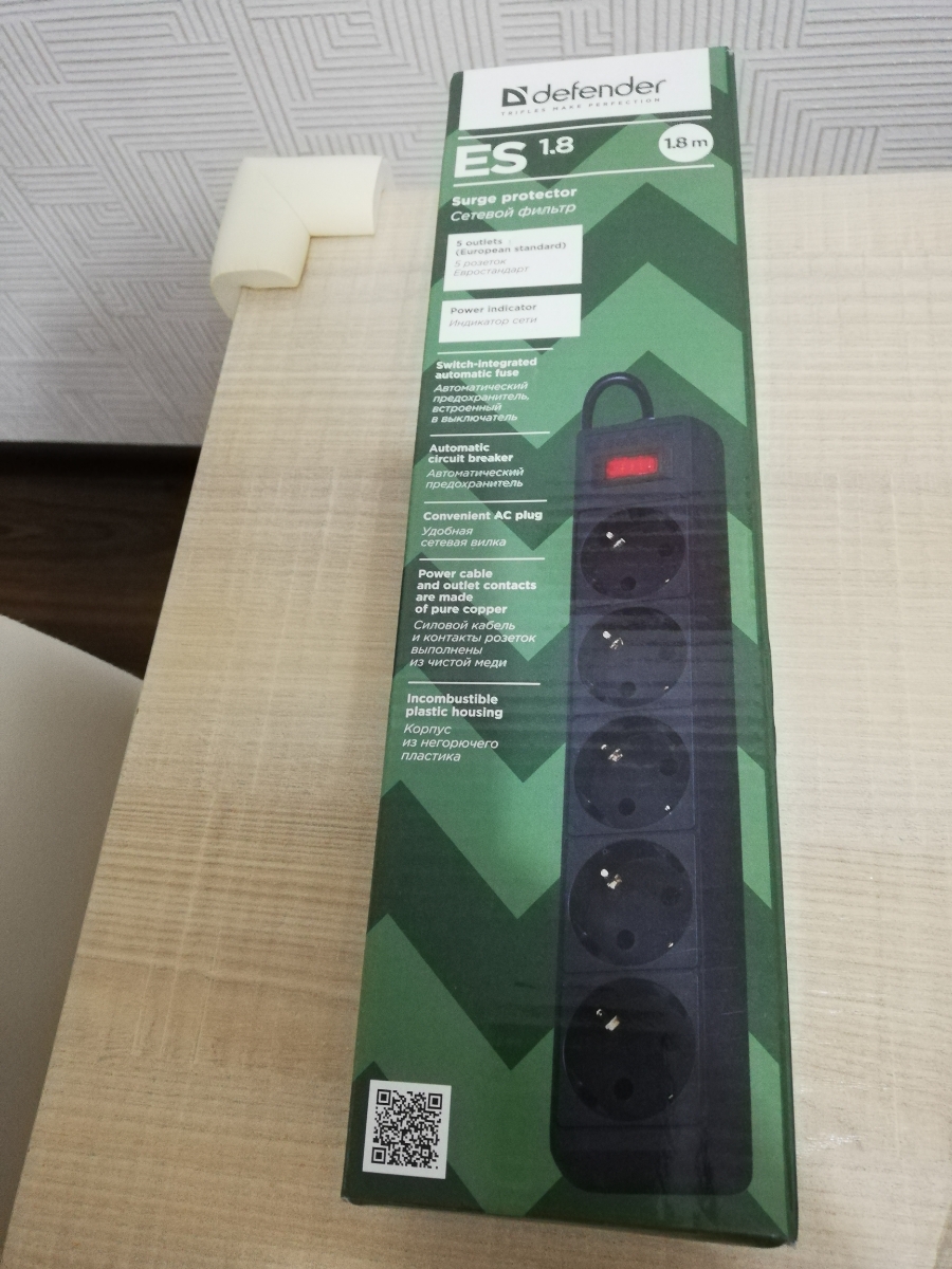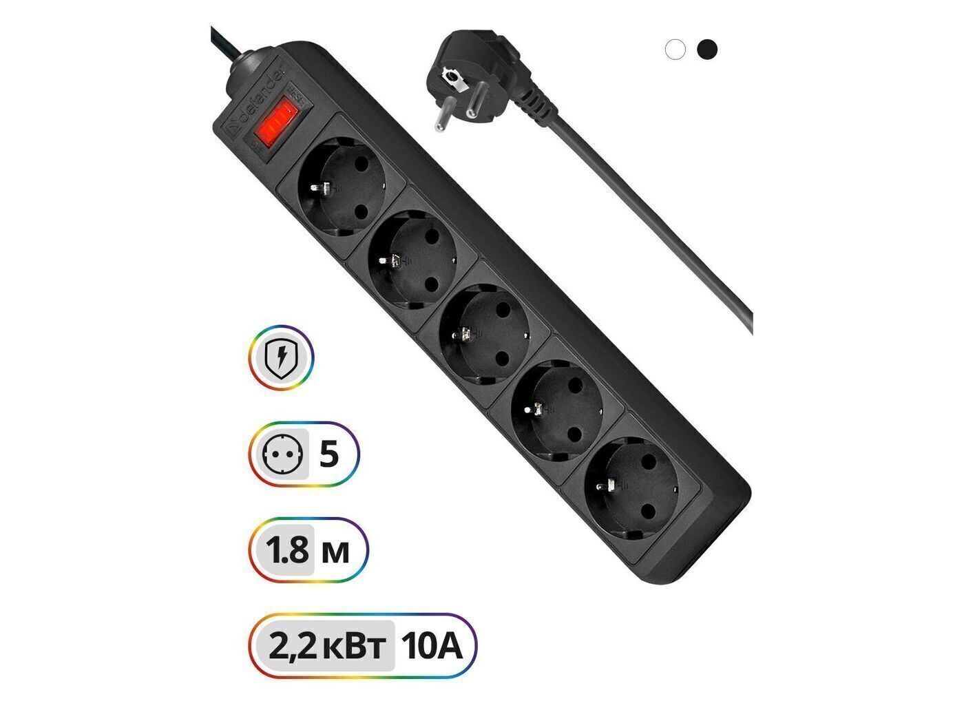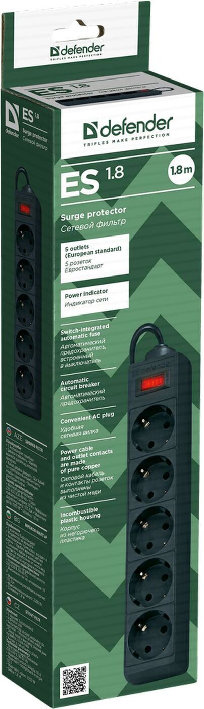 Сетевой фильтр Defender, 5 розеток, 10 А, 1.8 м, черный