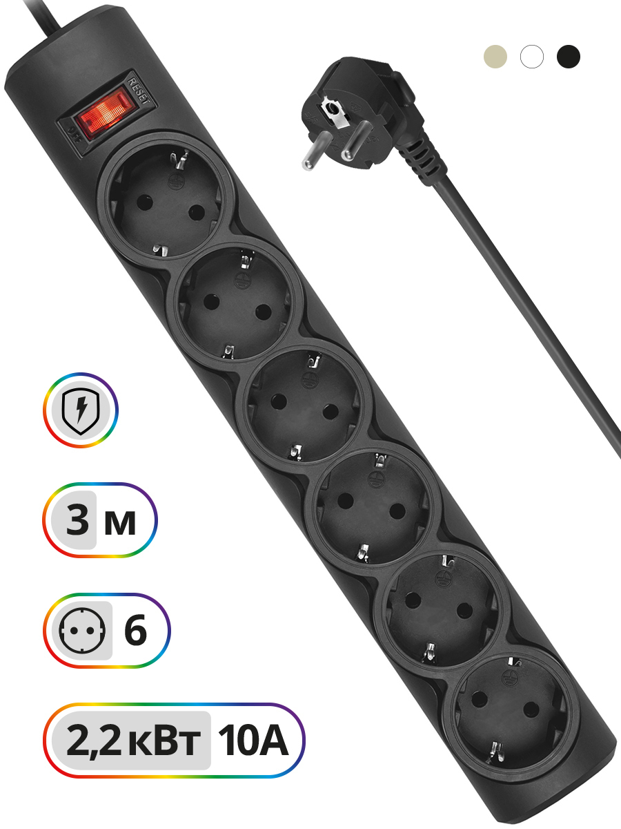 Сетевой фильтр-удлинитель Defender 6 розеток с заземлением , 3 метра , выключатель , черный